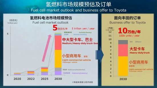 基于這一判斷,豐田將使用MIRAI的氫能部件,推進(jìn)燃料電池的對(duì)外銷售,在2030年預(yù)計(jì)達(dá)到10萬(wàn)輛的外銷訂單規(guī)模,而氫燃料電池市場(chǎng)將以商用車為中心實(shí)現(xiàn)增長(zhǎng)。
