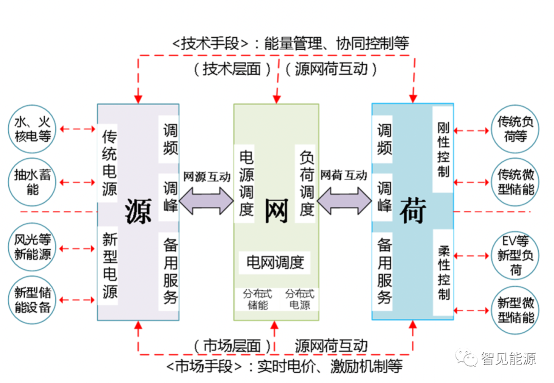 (3)源網(wǎng)荷儲(chǔ):是一個(gè)需要保持瞬時(shí)平衡的系統(tǒng)。在傳統(tǒng)的電力系統(tǒng)中,發(fā)電量主要通過發(fā)電機(jī)組的旋轉(zhuǎn)慣性和調(diào)頻能力來調(diào)節(jié),即所謂的電力平衡“源隨荷動(dòng)”。與傳統(tǒng)電網(wǎng)相比,新型電力系統(tǒng)的電網(wǎng)發(fā)展將形成以大電網(wǎng)為主、多種電網(wǎng)形式并存的模式。