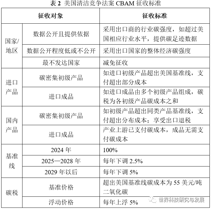 為此,美國《清潔競爭法案》跳出思維定式,直接以美國相應(yīng)產(chǎn)品的平均碳含量為衡量基準(zhǔn),采用弱化碳成本量化的形式簡化全國性碳稅的復(fù)雜進(jìn)程,以最低成本、最快時(shí)間構(gòu)建起CBAM體系,并逐步受到兩黨支持,美國版碳關(guān)稅也正式提上議程。