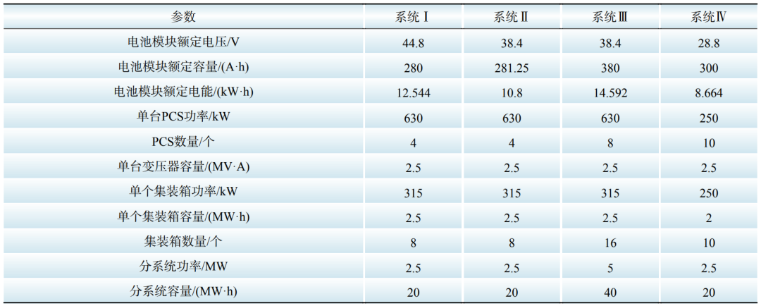 各儲能分系統(tǒng)所用單體電池均為額定電壓3.2 V的磷酸鐵鋰電池,由表7可知,儲能分系統(tǒng)Ⅰ、Ⅱ、Ⅳ功率/容量配置相同,均為2.5 MW/20 MW·h,儲能分系統(tǒng)Ⅲ為兩組完全相同的2.5 MW/20 MW·h儲能單元組成。其中,分系統(tǒng)Ⅰ、Ⅱ所用電池模組電壓不同;分系統(tǒng)Ⅱ、Ⅲ所用電池模組電壓相同,但容量不同。