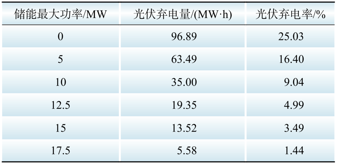 表6 配置不同功率儲能系統(tǒng)的光伏棄電損失