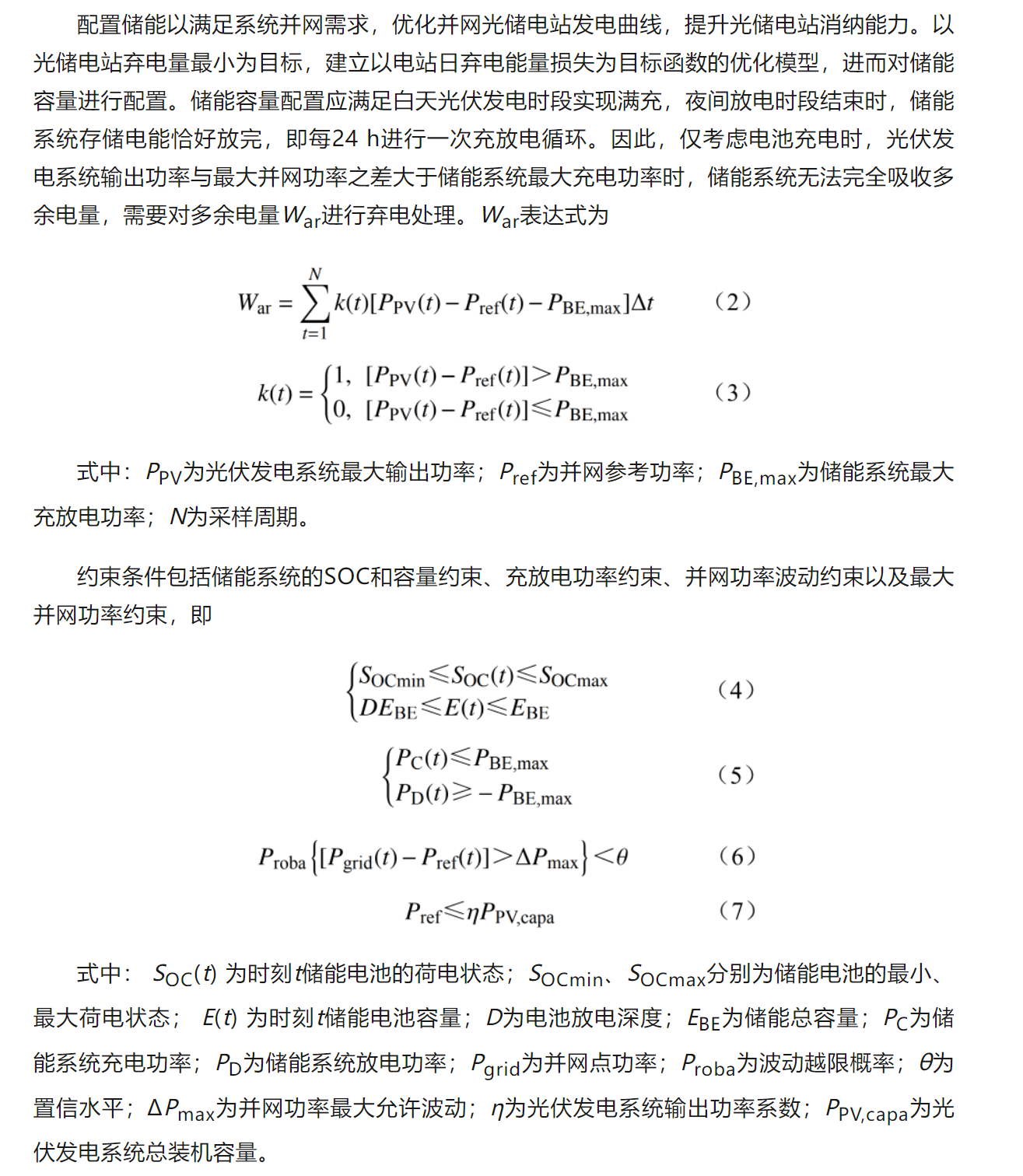 “雙碳”目標(biāo)推動了集中式并網(wǎng)光儲電站快速發(fā)展,國內(nèi)外學(xué)者對光儲電站的選型設(shè)計(jì)開展了較多的研究。文獻(xiàn)[11]從光伏組件的性能、成本和空間要求分析了不同組件的適用范圍,為光伏電站的開發(fā)利用提供了參考;文獻(xiàn)[12]研究了不同類型光伏組件在不同季節(jié)、太陽輻照度和溫度相同情況下輸出功率的差異性,對比實(shí)驗(yàn)結(jié)果得到晶硅光伏組件效率受光譜影響較小,具有更強(qiáng)的環(huán)境適應(yīng)能力;文獻(xiàn)[13]分析了不同光伏組件和排布方式的經(jīng)濟(jì)性,提出了光伏電站優(yōu)化設(shè)計(jì)方案;文獻(xiàn)[14]針對集中式和分布式能源系統(tǒng),考慮技術(shù)約束、經(jīng)濟(jì)和環(huán)境因素,提出了適用不同系統(tǒng)的儲能方式,并通過實(shí)例驗(yàn)證了可行性。