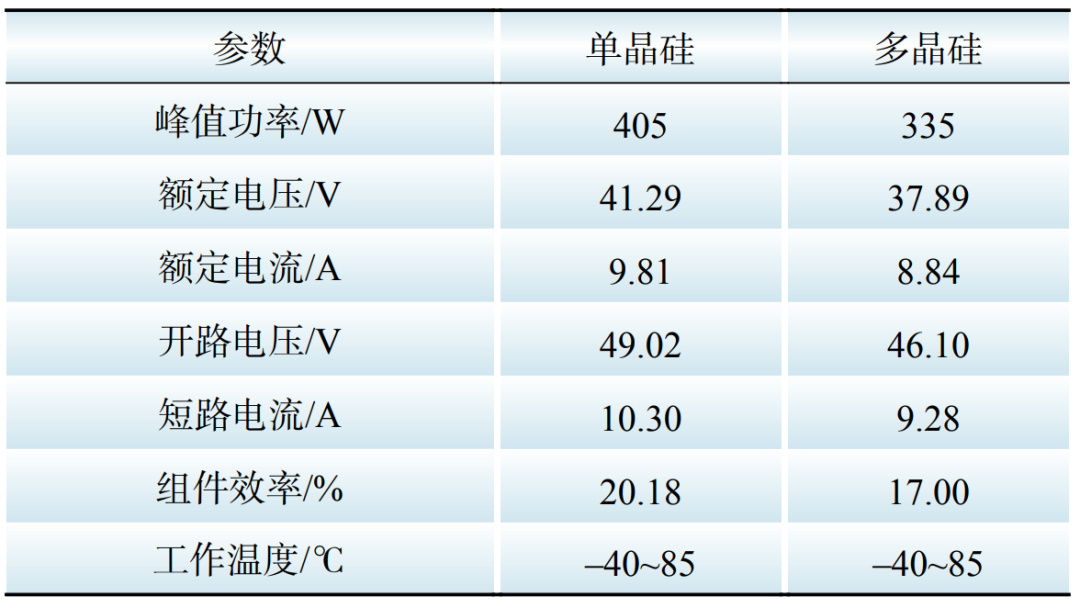 單晶硅光伏組件相較于多晶硅光伏組件具有更好的弱光性、更高的光電轉(zhuǎn)化效率和更低的衰減率,但多晶硅光伏組件技術(shù)更加成熟、綜合成本更低。根據(jù)光伏發(fā)電系統(tǒng)50 MW裝機(jī)容量和場址面積,選用26塊型號為CETC-405 M的405 W單晶硅光伏組件或28塊型號為CETC-335 P的335 W多晶硅光伏組件串聯(lián)組成1個光伏陣列,光伏陣列經(jīng)匯流箱匯流后接入光伏逆變器組成1個光伏發(fā)電單元,共16個發(fā)電單元、133190塊光伏組件。光伏陣列設(shè)計(jì)參數(shù)如表2所示,標(biāo)準(zhǔn)測試條件下(STC:AM1.5;1000 W/m2;25 ℃)2種光伏組件參數(shù)見表3。