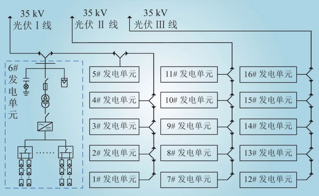 采用“分區(qū)發(fā)電、集中并網(wǎng)”模式將50 MW光伏發(fā)電系統(tǒng)劃分為16個容量均為3.125 MW的發(fā)電單元,通過并網(wǎng)光伏逆變器將光伏組件所發(fā)直流電轉(zhuǎn)化為交流電,經(jīng)變壓器升壓后接入35 kV交流母線,50 MW光伏發(fā)電系統(tǒng)架構(gòu)如圖4所示。