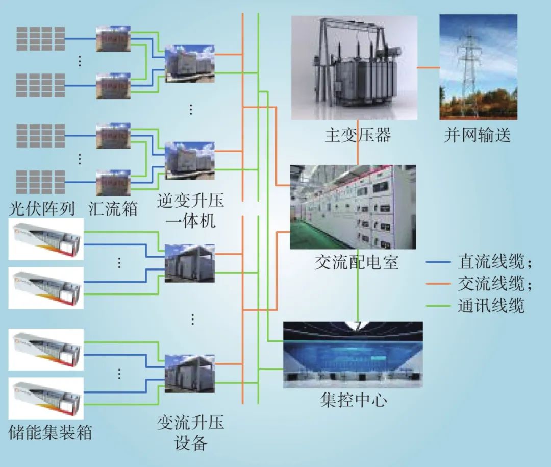 并網(wǎng)光儲電站由光伏發(fā)電系統(tǒng)、儲能系統(tǒng)和并網(wǎng)升壓系統(tǒng)組成。光伏發(fā)電系統(tǒng)包括由光伏組件串聯(lián)組成的光伏陣列、匯流箱和逆變升壓設(shè)備;儲能系統(tǒng)包括儲能集裝箱和變流升壓設(shè)備;并網(wǎng)升壓系統(tǒng)包括交流配電裝置和升壓變壓器等,連接結(jié)構(gòu)如圖3所示。