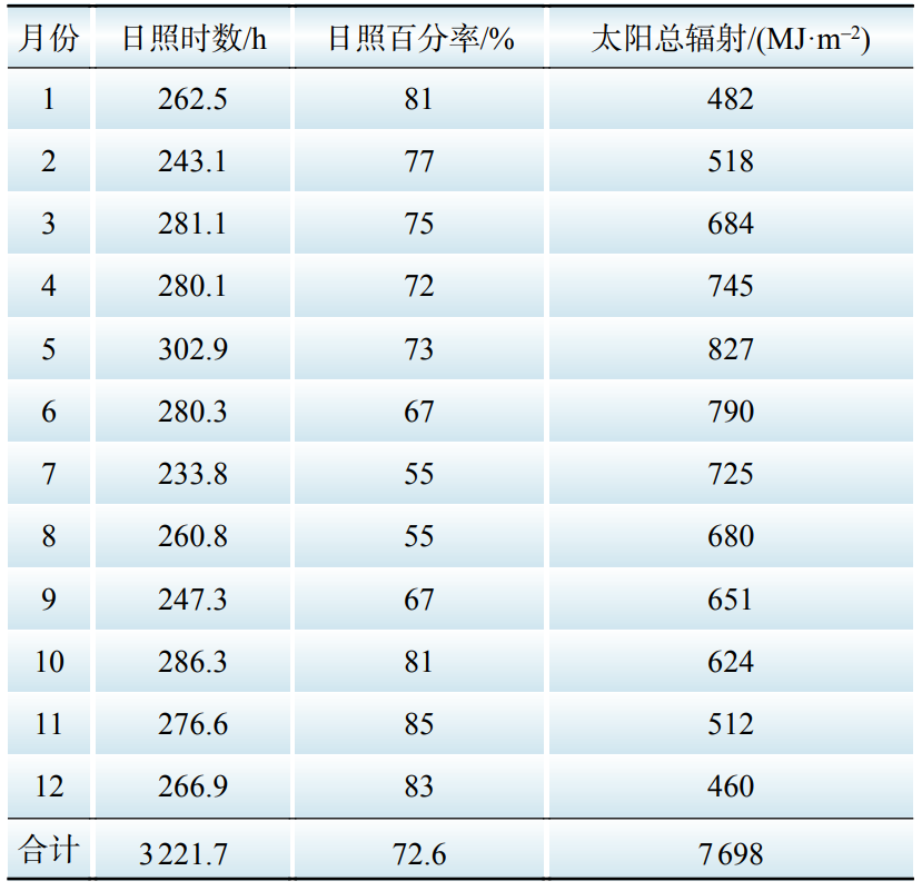 結(jié)合拉薩市氣候?qū)W計(jì)算方法的經(jīng)驗(yàn)系數(shù)和日喀則近30年月平均日照百分率,采用氣候?qū)W方法估算多年平均太陽總輻射如表1所示。由表1可知,該地區(qū)年日照時長達(dá)3221.7 h,太陽總輻射達(dá)7698 MJ/m2,為太陽能資源最豐富地區(qū)[20]。