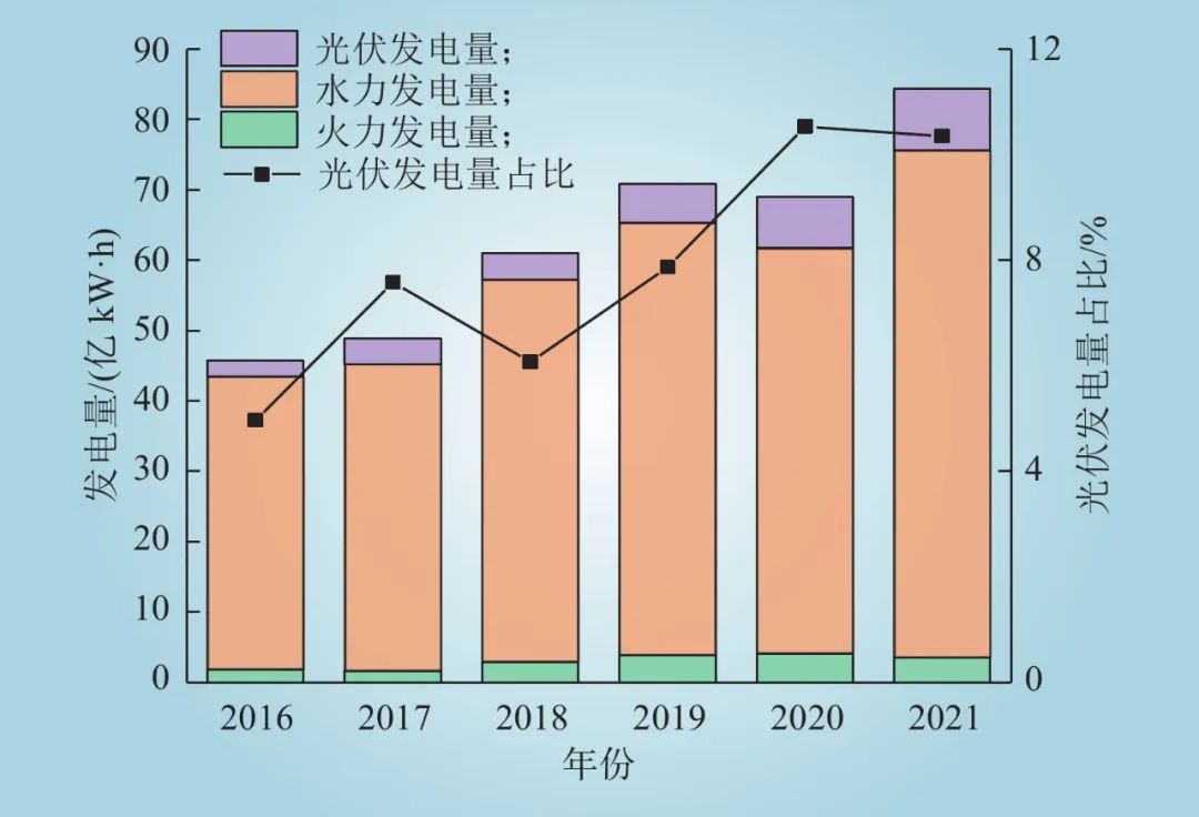 從電源結(jié)構(gòu)來看,西藏以水電為主,以光伏、火電作為輔助電源。圖1為2016—2021年西藏自治區(qū)水電、火電、光伏發(fā)電量統(tǒng)計(jì),由圖1可知,近年來西藏光伏發(fā)電得到了大力發(fā)展,其發(fā)電量由2016年的2.27億kW·h上升至2021年的8.73億kW·h,發(fā)電量占比由4.97%提高至10.35%。