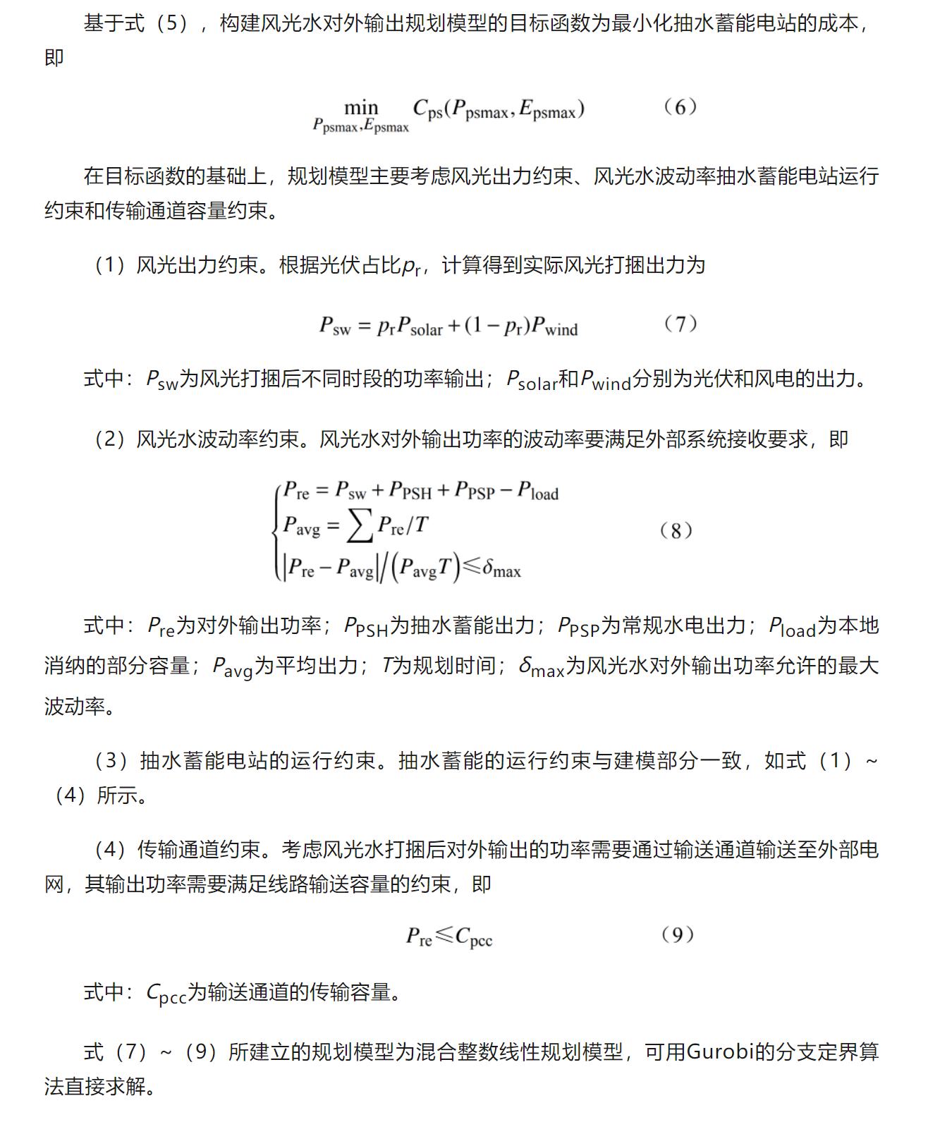 摘要:跨區(qū)域、大規(guī)模的新能源電力輸送是應(yīng)對(duì)國(guó)內(nèi)風(fēng)光資源與負(fù)荷中心逆向分布特點(diǎn)與實(shí)現(xiàn)碳中和的必然要求,而風(fēng)光出力固有的隨機(jī)性、間歇性和波動(dòng)性給新能源打捆穩(wěn)定輸送帶來(lái)了挑戰(zhàn)。水電具有的“電源+儲(chǔ)能”的雙重身份為平抑新能源波動(dòng)、提升-風(fēng)-光-水混合能源系統(tǒng)靈活性,以及促進(jìn)新能源打捆外送提供了解決思路。以抽水蓄能為例,針對(duì)風(fēng)-光-抽水蓄能混合能源系統(tǒng),提出一種計(jì)及抽水蓄能電站運(yùn)行功率約束、庫(kù)容約束、進(jìn)出水量約束的容量配置優(yōu)化方法,旨在量化抽水蓄能對(duì)新能源打捆外送的助力效果,即確定單位抽水蓄能可支撐的新能源外送容量,構(gòu)建并求解以最小化抽水蓄能投資成本為目標(biāo)且滿(mǎn)足各典型運(yùn)行場(chǎng)景的容量規(guī)劃模型。