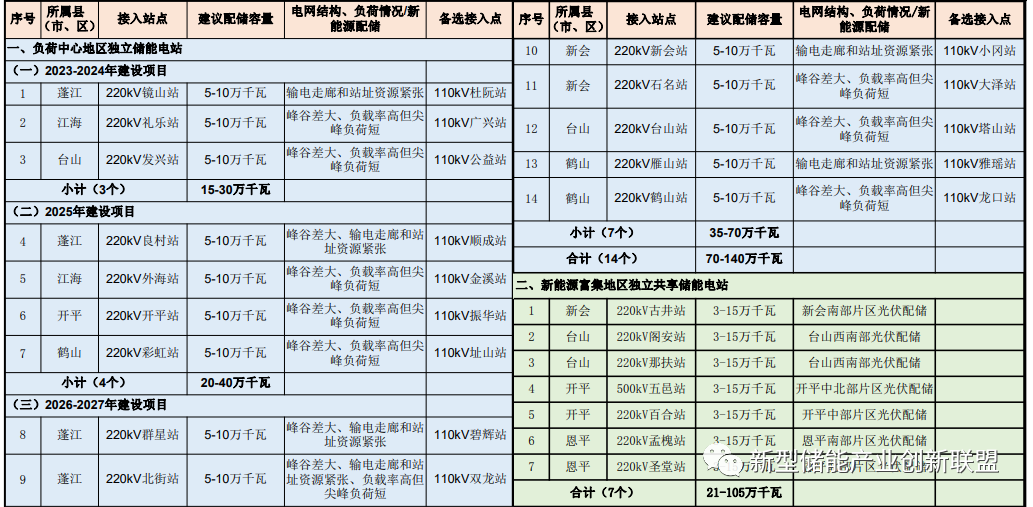 《實(shí)施方案》明確,2025年江門市新型儲能裝機(jī)將達(dá)1.5吉瓦,2027達(dá)到2.6吉瓦以上。在項(xiàng)目布局方面,電源側(cè),《實(shí)施方案》要求2022年以后新增規(guī)劃的海上風(fēng)電項(xiàng)目以及2023年7月1日以后新增并網(wǎng)的集中式光伏電站和陸上集中式風(fēng)電項(xiàng)目,按照不低于10%/1小時(shí)標(biāo)準(zhǔn)配置新型儲能;電網(wǎng)側(cè),《實(shí)施方案》引導(dǎo)在新能源富集地區(qū)、負(fù)荷中心地區(qū)布局電網(wǎng)側(cè)獨(dú)立儲能電站。