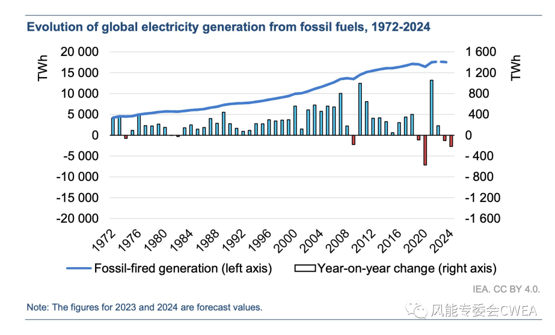 IEA表示,能源轉型正在形成的另一個跡象是,在2019年至2024年的六年中,化石燃料發(fā)電量有四年出現(xiàn)下降。過去,化石燃料發(fā)電量持續(xù)幾年下降的情況非常罕見,主要發(fā)生在全球能源和金融危機之后,因為當時全球的電力需求受到嚴重抑制。但近些年來,即使電力需求在不斷增長,化石燃料發(fā)電量也不會同步增長,反而會出現(xiàn)下降。