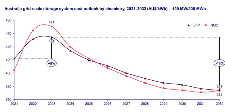 由于在澳大利亞部署的儲能項(xiàng)目主要針對高價值的頻率控制和輔助服務(wù)(FCAS)市場,持續(xù)時間為兩小時的電網(wǎng)規(guī)模電池儲能系統(tǒng)目前是主流的儲能技術(shù)。到2032年,預(yù)計(jì)磷酸鐵鋰電池(LFP)和NMC三元鋰離子電池價格將下降40%以上。這反過來將推動電池儲能系統(tǒng)成本在未來十年內(nèi)下降18%至21%,這成為削減資本支出的最大動力。