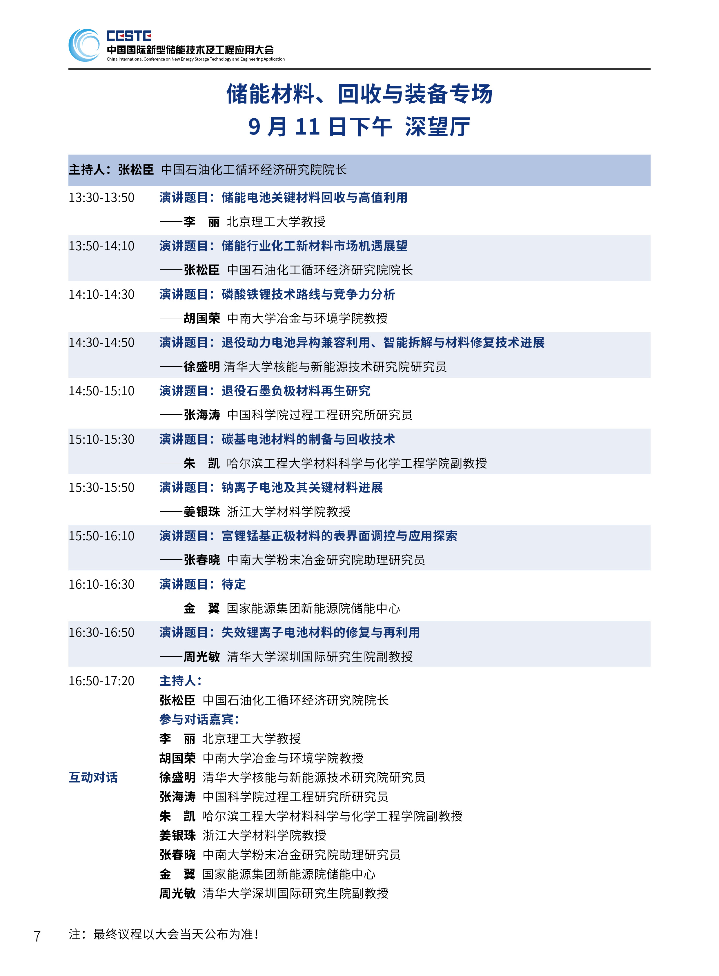 本屆大會將安排:大會開幕式暨碳中和能源院士高峰論壇、長時儲能技術(shù)及應(yīng)用、共享儲能、工商業(yè)儲能、混合儲能解決方案、安全與系統(tǒng)集成、新能源動力系統(tǒng)控制技術(shù)、儲能金融與投資、全生命周期碳足跡分析與應(yīng)用技術(shù)、儲能材料、回收與裝備等10個專場論壇,以下為儲能材料、回收與裝備專場議程。