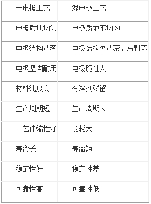 下表列出采用干電極工藝和濕電極工藝的具體比較:
