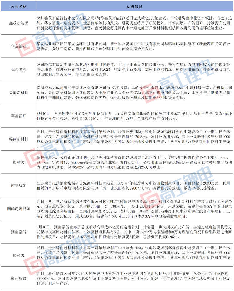 據(jù)高工鋰電不完全統(tǒng)計(jì),8月中上旬,鋰電產(chǎn)業(yè)回收環(huán)節(jié)已發(fā)生近十起擴(kuò)產(chǎn)動態(tài),總計(jì)超40萬噸鋰電回收項(xiàng)目接連開工。另外,鋰電回收領(lǐng)域亦發(fā)生數(shù)個超億級別投融資項(xiàng)目。
