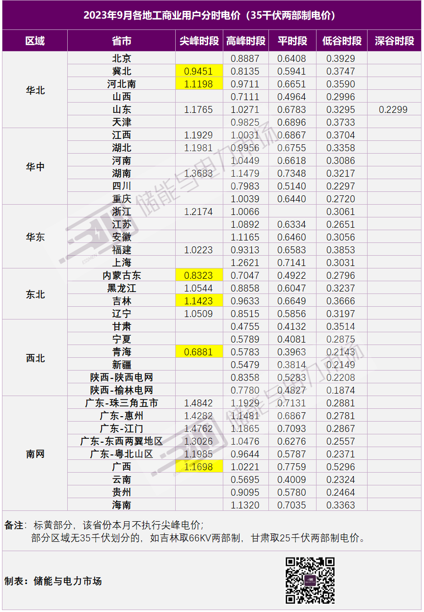 9月全國不少區(qū)域已經(jīng)不是夏季用電高峰,不再使用尖峰電價,如河北南、冀北、蒙東、吉林、青海、廣西等地。各地分時電價如下表所示。