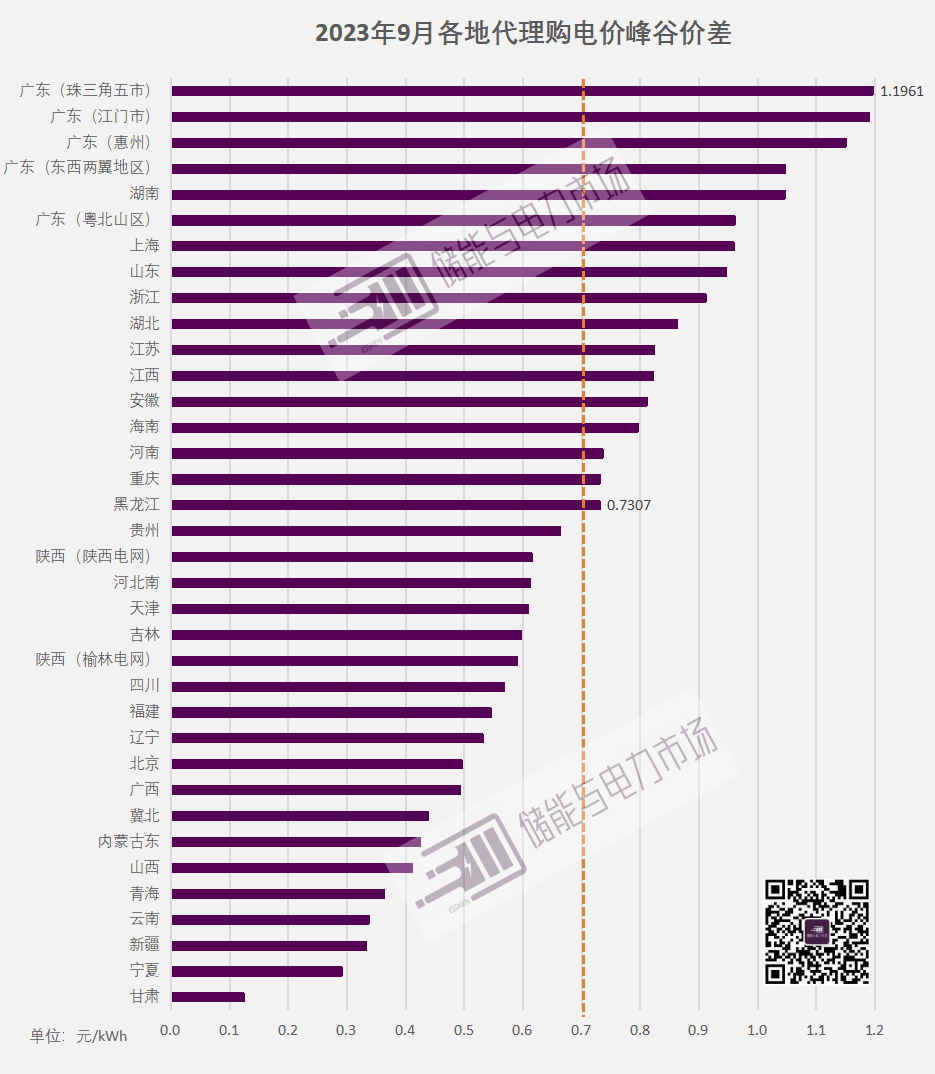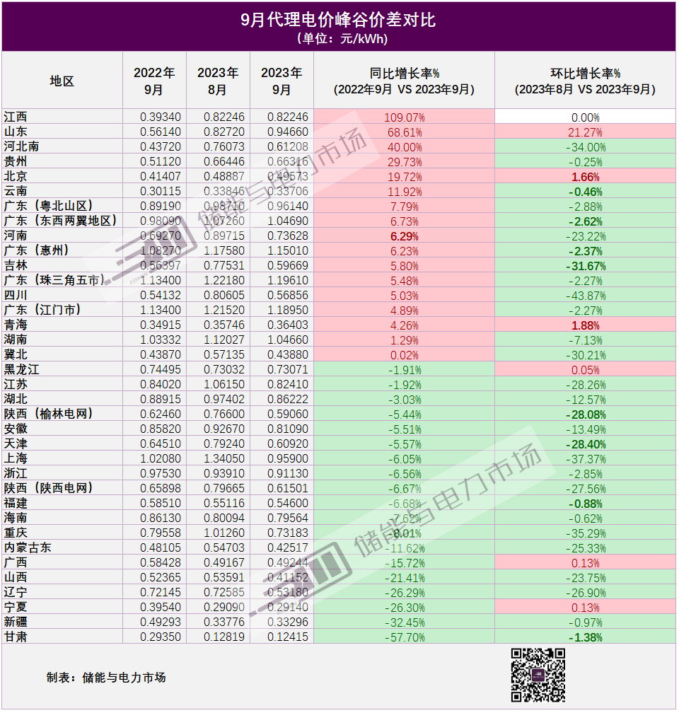 9月,不到5成區(qū)域峰谷價差同比增長。