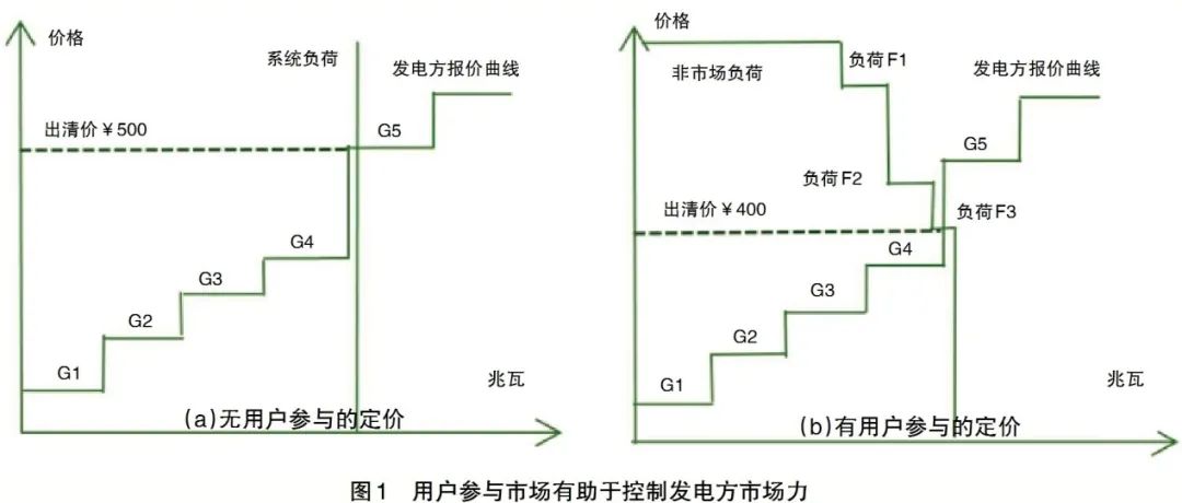 二是有助于控制發(fā)電方的市場力,降低用戶購電成本。當(dāng)發(fā)電方要價過高時,部分用戶可以降低負荷需求,平衡供需關(guān)系。如圖(a)所示,如果市場競爭中沒有用戶直接參與,系統(tǒng)的需求曲線就是一條豎直的直線,市場出清價則由報價最高的邊際發(fā)電機組設(shè)定,邊際機組G5可以通過提高報價來提高市場出清價,用戶只能作為價格接受者被動接受市場價格,無法體現(xiàn)出用戶的交易意愿。但是如果用戶報價可以參與市場出清,如圖(b)所示,原來的邊際機組G5便無法中標(biāo)。市場出清價則由用戶F3來確定。G5如果想要中標(biāo),其報價就必須低于用戶F3。因此,因為有用戶F3的參與,G5的市場力得到了有效控制。