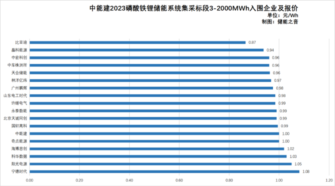 然后,在今年7月底公示的“中國能建2023年度磷酸鐵鋰電池儲能系統(tǒng)集中采購結果”顯示,比亞迪直接報出了全場最低價,為0.87元/Wh,再次刷新了行業(yè)認知,成為業(yè)內又一條巨大的“低價鯰魚”。