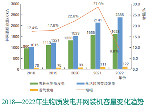 2022年,新增裝機(jī)334萬(wàn)千瓦,累計(jì)并網(wǎng)裝機(jī)容量達(dá)到4132萬(wàn)千瓦,同比增長(zhǎng)8.8%。年發(fā)電量達(dá)到1824億千瓦時(shí),較2021年增加11.4%,占全部電源總年發(fā)電量2.1%。生活垃圾焚燒發(fā)電新增裝機(jī)占累計(jì)新增裝機(jī)76.9%,較2021年提高5個(gè)百分點(diǎn)。全國(guó)生物天然氣累計(jì)年產(chǎn)氣規(guī)模為2.3億立方米,固體成型燃料年產(chǎn)量2400萬(wàn)噸,燃料乙醇年產(chǎn)量320萬(wàn)噸,生物柴油年產(chǎn)量130萬(wàn)噸。