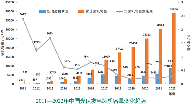 2022年,新增裝機(jī)8741萬(wàn)千瓦,全部為光伏發(fā)電。累計(jì)太陽(yáng)能裝機(jī)容量達(dá)到39261萬(wàn)千瓦,同比增長(zhǎng)28.6%。全國(guó)太陽(yáng)能發(fā)電量達(dá)4276億千瓦時(shí),同比增長(zhǎng)30.8%,占全部電源總年發(fā)電量的4.9%,較2020年提升1個(gè)百分點(diǎn)。全年棄光率1.7%,較2021年進(jìn)一步下降。
