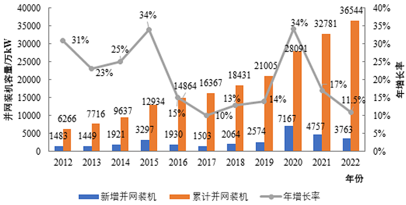2022年,中國(guó)新增并網(wǎng)裝機(jī)3763萬(wàn)千瓦;其中,陸上風(fēng)電新增3258萬(wàn)千瓦,海上風(fēng)電新增505萬(wàn)千瓦。風(fēng)電累計(jì)裝機(jī)36544萬(wàn)千瓦,同比增長(zhǎng)11.5%。全年風(fēng)電發(fā)電量達(dá)7624億千瓦時(shí),同比增長(zhǎng)16.3%,占全部電源總年發(fā)電量的8.8%,較2021年提高1個(gè)百分點(diǎn)。2022年全國(guó)風(fēng)電平均利用率96.8%,繼續(xù)保持較高水平。裝備制造產(chǎn)業(yè)持續(xù)壯大,中國(guó)風(fēng)電機(jī)組整機(jī)生產(chǎn)企業(yè)約20家,整機(jī)產(chǎn)量居世界首位,其中6家新增并網(wǎng)裝機(jī)容量位居全球前十。