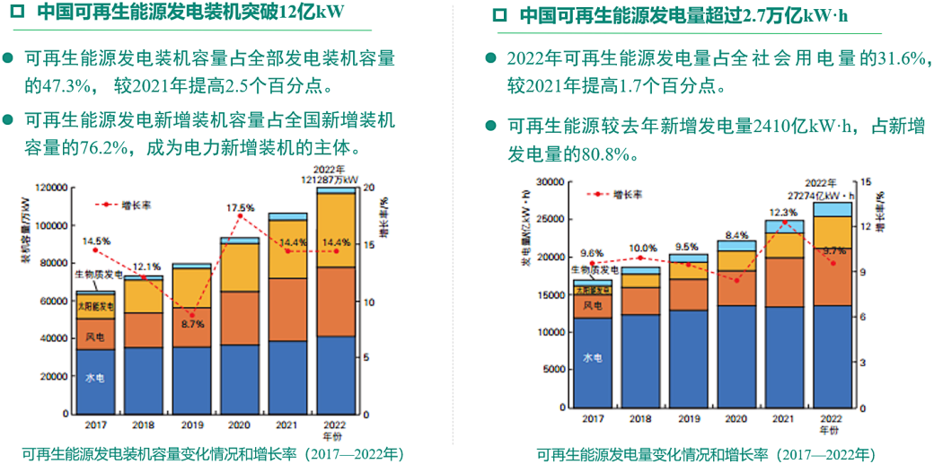 2022年,中國(guó)可再生能源發(fā)展成績(jī)斐然。全年新增可再生能源裝機(jī)1.52億千瓦,占全國(guó)新增發(fā)電裝機(jī)的76.2%,是新增電力裝機(jī)的絕對(duì)主力。全年風(fēng)電、光伏年發(fā)電量首次突破1萬(wàn)億千瓦時(shí),接近中國(guó)城鄉(xiāng)居民生活用電的總量,可再生能源在保障能源供應(yīng)方面發(fā)揮的作用越來(lái)越明顯。以沙漠、戈壁、荒漠為重點(diǎn)的大型風(fēng)電光伏基地全面推進(jìn),以烏東德、白鶴灘、溪洛渡、向家壩、三峽、葛洲壩為核心的世界最大“清潔能源走廊”全面建成。