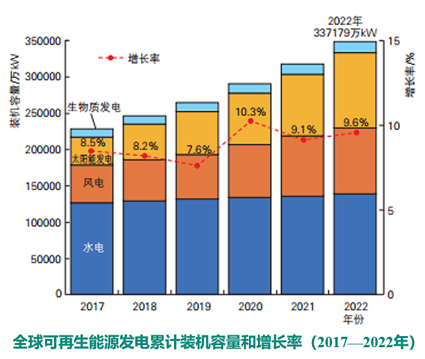 中國(guó)儲(chǔ)能網(wǎng)訊:大力發(fā)展可再生能源已經(jīng)成為保障世界能源安全和推動(dòng)能源轉(zhuǎn)型發(fā)展、應(yīng)對(duì)氣候變化的必然選擇。2022年,全球有60多個(gè)國(guó)家超過10%的發(fā)電量由可再生能源提供。全球可再生能源發(fā)電裝機(jī)容量達(dá)33.72億千瓦。新增裝機(jī)容量達(dá)2.95億千瓦,占新增總裝機(jī)容量的比重達(dá)到83%,增長(zhǎng)率9.6%。中國(guó)是全球可再生能源發(fā)電新增裝機(jī)容量最大貢獻(xiàn)者,占全球新增裝機(jī)容量的51.7%。中國(guó)明確提出加快規(guī)劃建設(shè)新型能源體系的目標(biāo),指明了中國(guó)能源轉(zhuǎn)型發(fā)展的戰(zhàn)略方向,中國(guó)可再生能源事業(yè)正處于快速發(fā)展的重大機(jī)遇期。