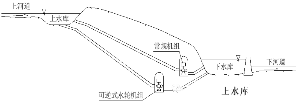 當(dāng)上水庫天然徑流較大,為了利用此部分天然徑流,既安裝了抽水蓄能機(jī)組、也安裝了部分常規(guī)水電機(jī)組,則此電站就為混合式抽水蓄能電站。