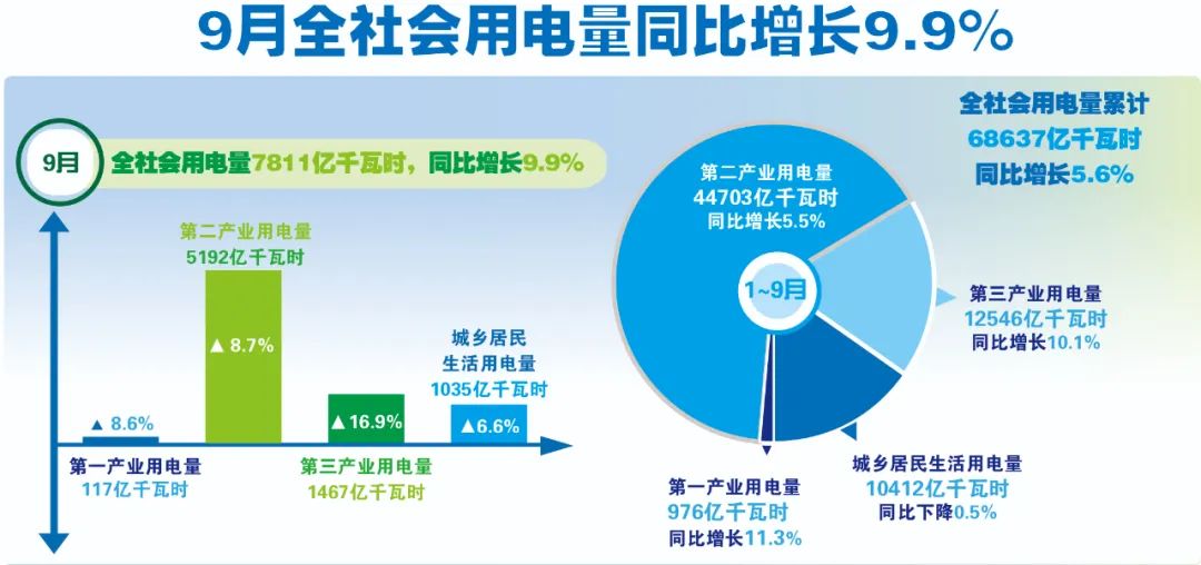 9月份,全社會(huì)用電量7811億千瓦時(shí),同比增長(zhǎng)9.9%。分產(chǎn)業(yè)看,第一產(chǎn)業(yè)用電量117億千瓦時(shí),同比增長(zhǎng)8.6%;第二產(chǎn)業(yè)用電量5192億千瓦時(shí),同比增長(zhǎng)8.7%;第三產(chǎn)業(yè)用電量1467億千瓦時(shí),同比增長(zhǎng)16.9%;城鄉(xiāng)居民生活用電量1035億千瓦時(shí),同比增長(zhǎng)6.6%。