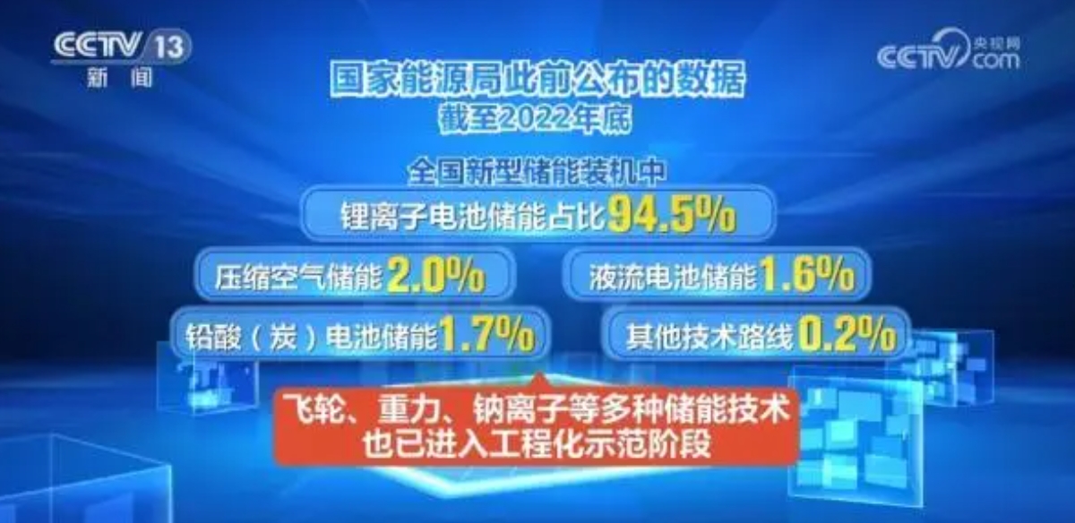 國家能源局此前公布的數(shù)據(jù),截至2022年底,全國新型儲(chǔ)能裝機(jī)中,鋰離子電池儲(chǔ)能占比94.5%、壓縮空氣儲(chǔ)能2.0%、液流電池儲(chǔ)能1.6%、鉛酸(炭)電池儲(chǔ)能1.7%,其他技術(shù)路線0.2%。飛輪、重力、鈉離子等多種儲(chǔ)能技術(shù)也已進(jìn)入工程化示范階段。