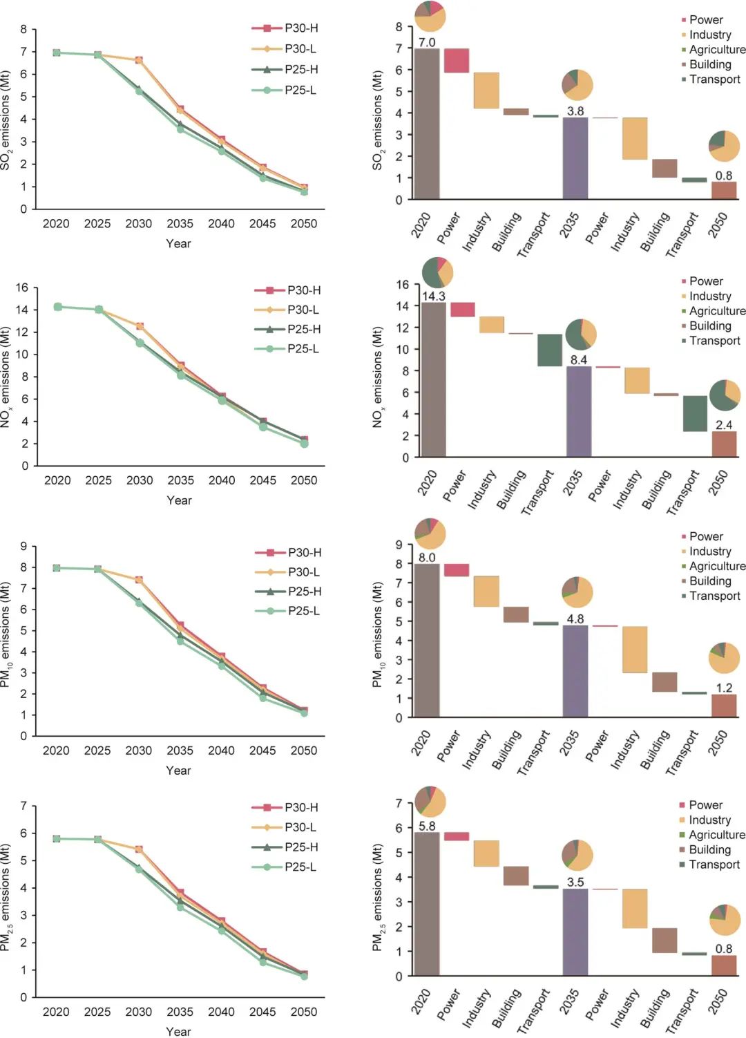 圖10. CO2減排對(duì)局地空氣污染物治理的協(xié)同效應(yīng)(左)和P25-H情景下,2020—2035年和2035—2050年兩段時(shí)期,各部門對(duì)于局地空氣污染物減排的貢獻(xiàn)分解(右)。