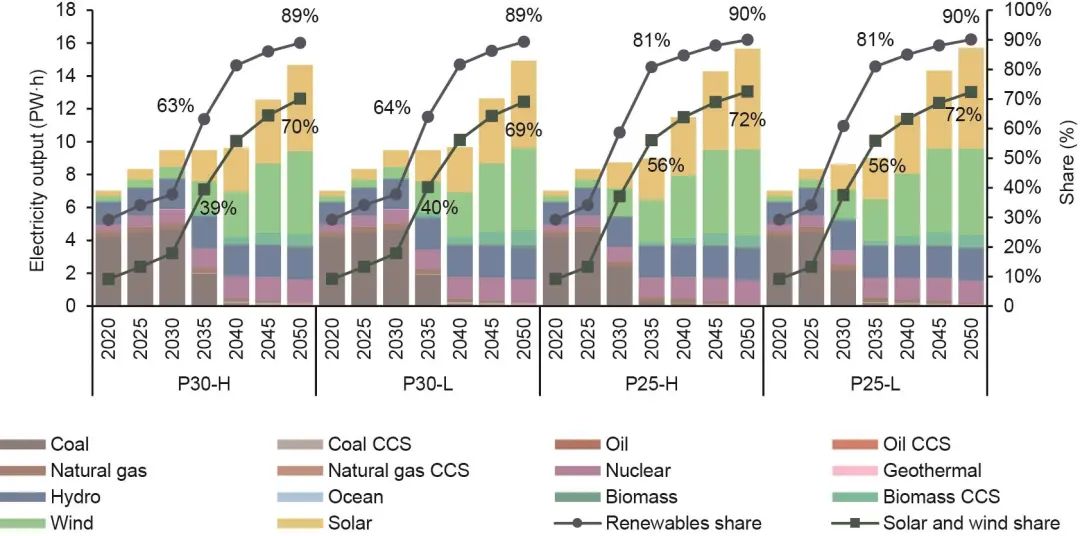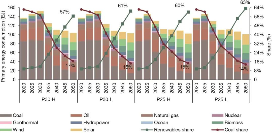 相比之下,可再生能源目前占一次能源消費(fèi)的10%,同時(shí)增長(zhǎng)緩慢,主要是為了滿足增量能源需求。未來,可再生能源將最有希望填補(bǔ)由煤炭消費(fèi)下降造成的缺口,從而逐步取代化石燃料。據(jù)測(cè)算,在2035—2040年,可再生能源將超越化石燃料,成為中國(guó)最主要的能源。到2050年,中國(guó)一次能源消費(fèi)中可再生能源比重將達(dá)到約60%。同樣,對(duì)于2050年碳預(yù)算較低或者開始減排較早的情景(P25-L、P25-H和P30-L),可再生能源的占比將更高。