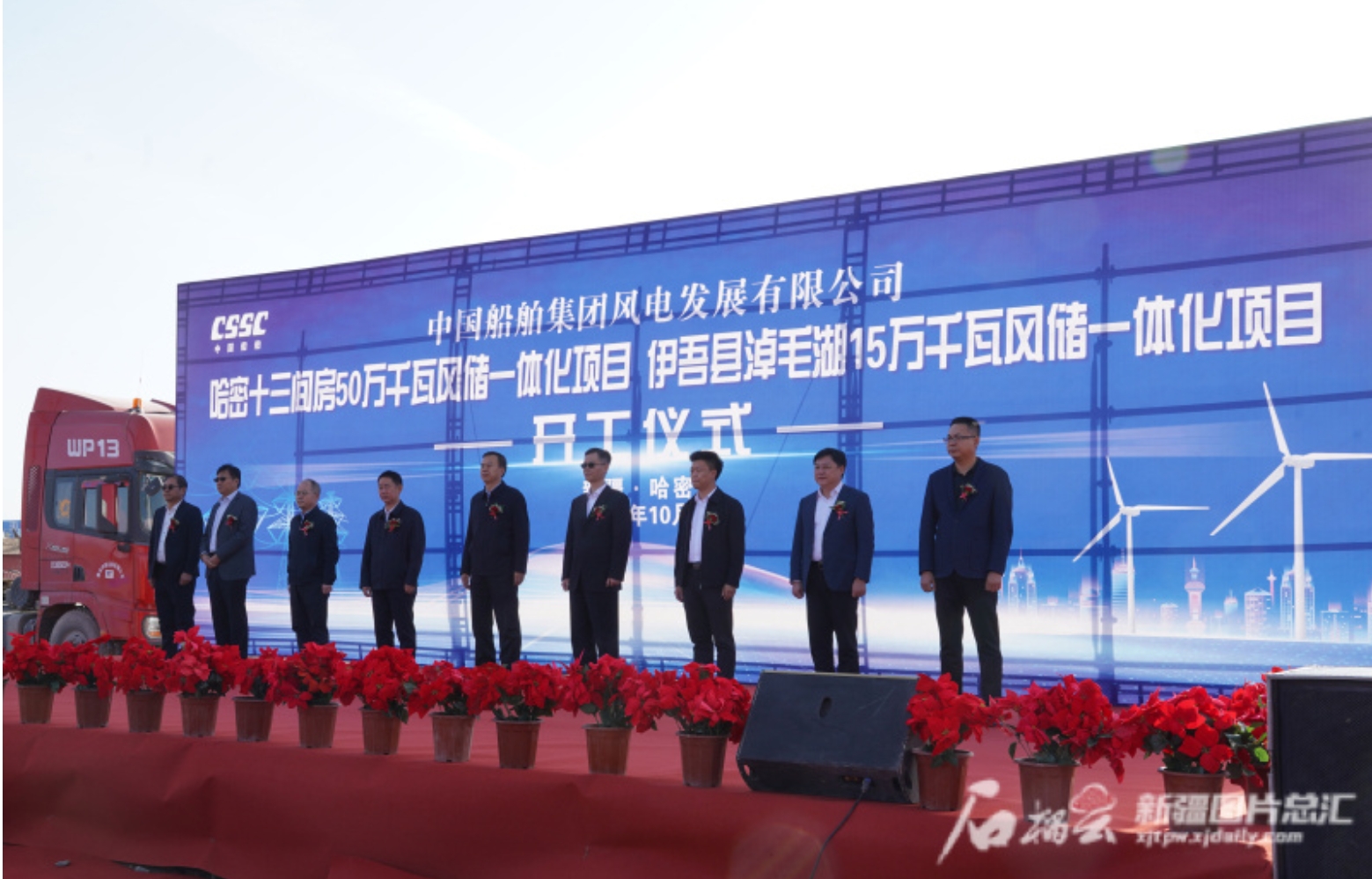 10月27日,在哈密高新技術(shù)產(chǎn)業(yè)開(kāi)發(fā)區(qū)北部新興產(chǎn)業(yè)園內(nèi),中國(guó)船舶集團(tuán)風(fēng)電發(fā)展有限公司哈密十三間房50萬(wàn)千瓦風(fēng)儲(chǔ)一體化項(xiàng)目、伊吾淖毛湖15萬(wàn)千瓦風(fēng)儲(chǔ)一體化項(xiàng)目同步舉行開(kāi)工儀式。郭子毅攝