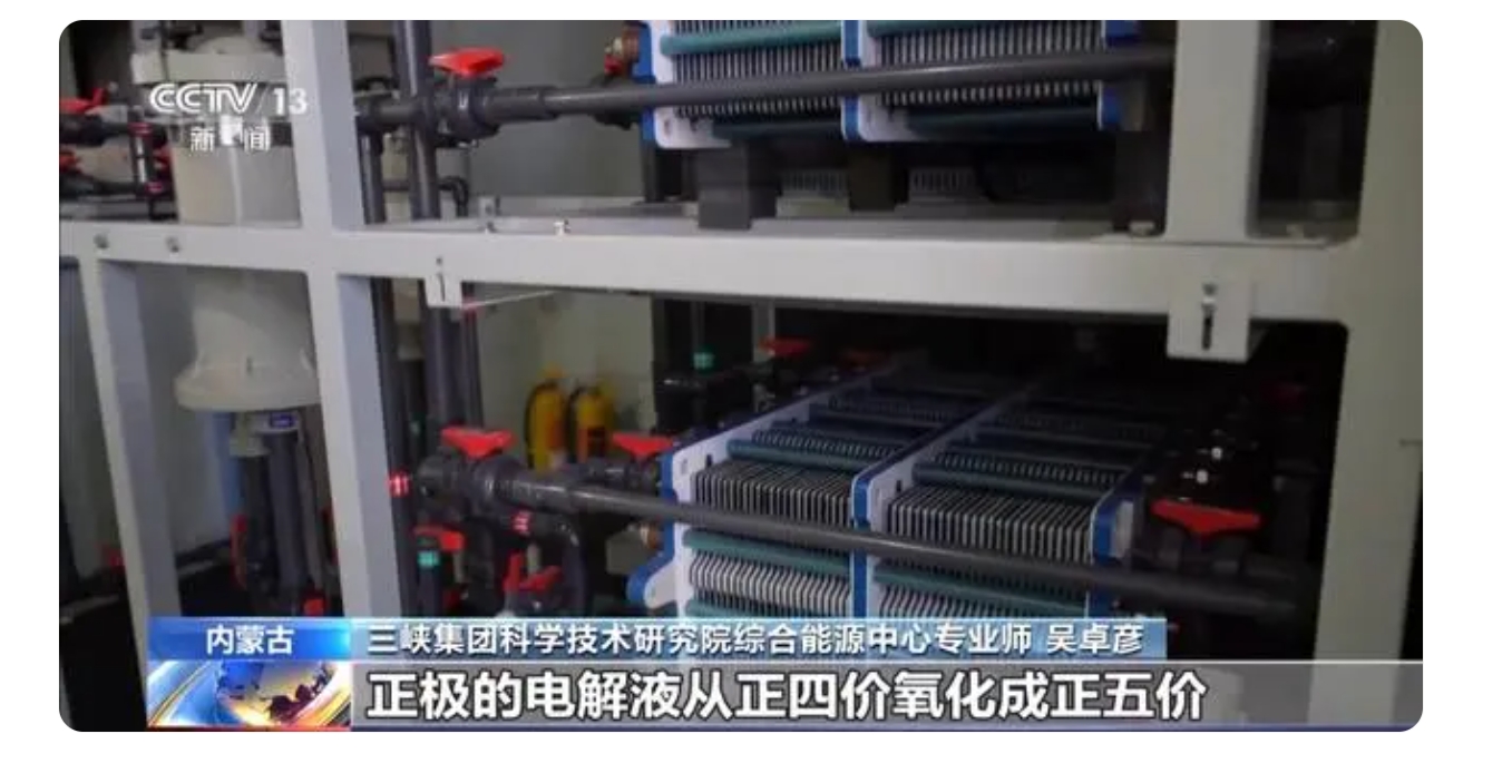 三峽集團(tuán)科學(xué)技術(shù)研究院綜合能源中心專業(yè)師吳卓彥:這套系統(tǒng)就是全釩液流電池儲(chǔ)能系統(tǒng),它的能量主要儲(chǔ)存在電解液中。在工作的時(shí)候,電解液通過(guò)管路還有泵,來(lái)到電堆。充電的時(shí)候,正極的電解液從正四價(jià)氧化成正五價(jià),把電能儲(chǔ)存起來(lái),在放電的時(shí)候,它從正五價(jià)再回到正四價(jià),把電能釋放出去。