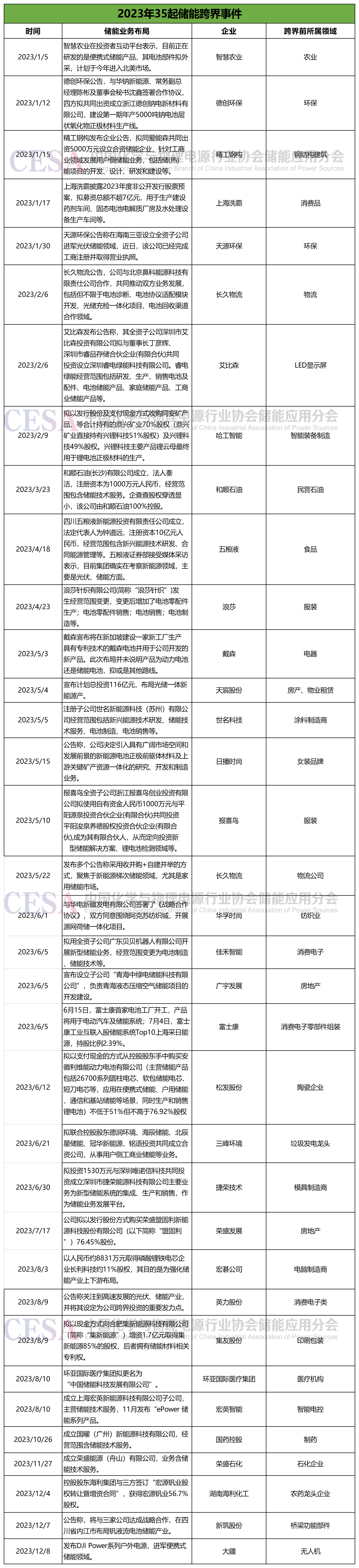 據(jù)中國(guó)儲(chǔ)能網(wǎng)不完全統(tǒng)計(jì),今年以來(lái),儲(chǔ)能領(lǐng)域已經(jīng)有35起跨界事件,這些跨界公司此前的主業(yè)可謂是五花八門(mén),包括農(nóng)業(yè)、房地產(chǎn)、制藥、酒企、服裝、物流等。