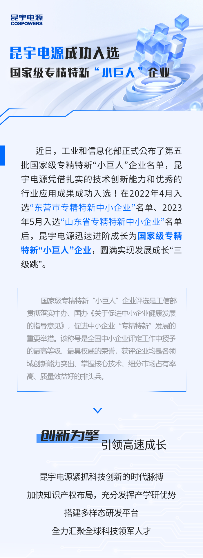 昆宇電源榮獲國家級(jí)專精特新“小巨人”企業(yè)