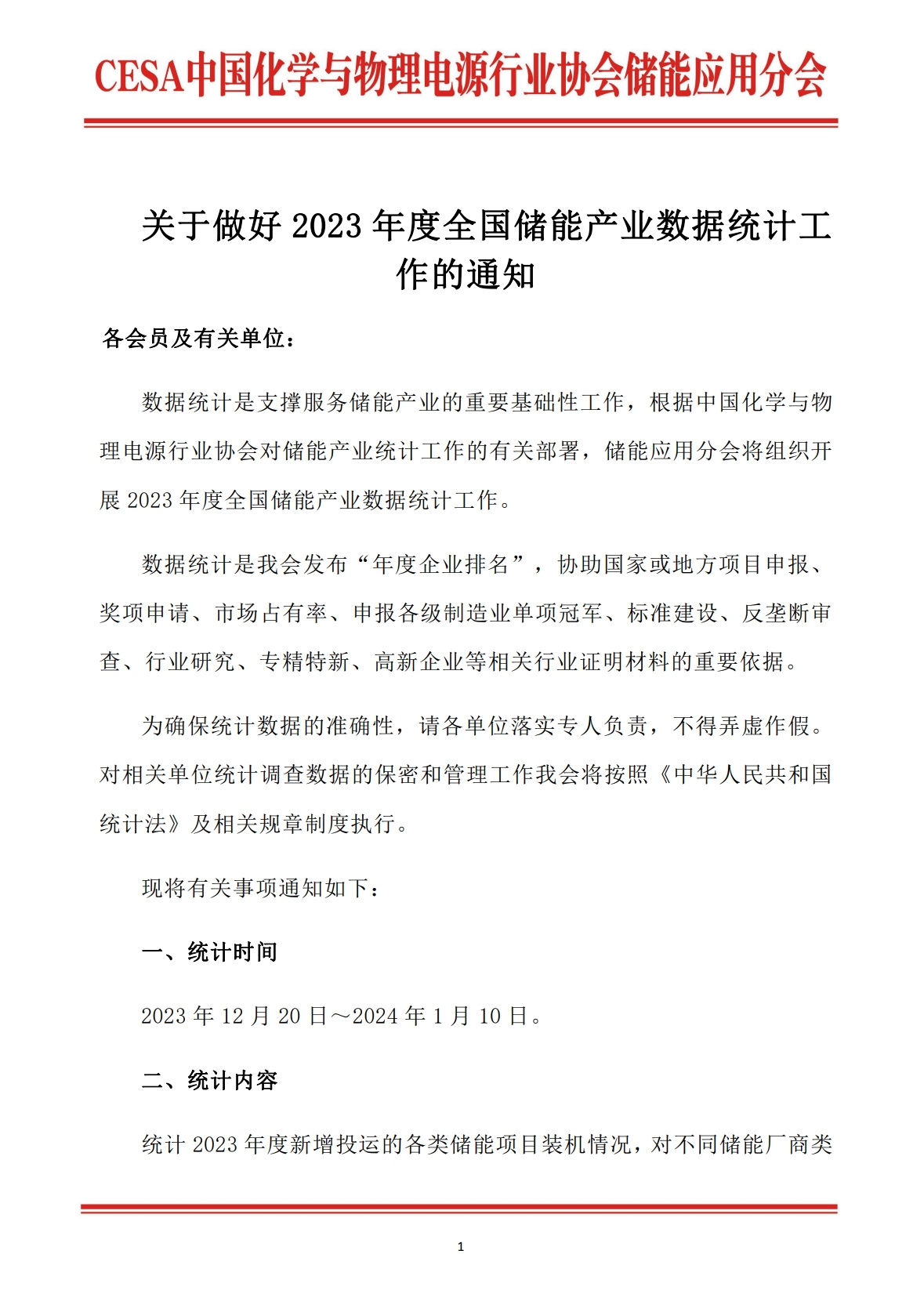 關(guān)于做好2023年度全國(guó)儲(chǔ)能產(chǎn)業(yè)數(shù)據(jù)統(tǒng)計(jì)工作的通知