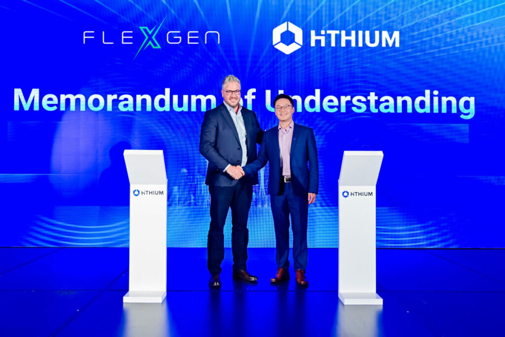 FlexGen公司首席商務(wù)官Yann Brandt(左)和商海辰儲(chǔ)能公司全球業(yè)務(wù)主管Mizhi Zhang簽署一項(xiàng)協(xié)議