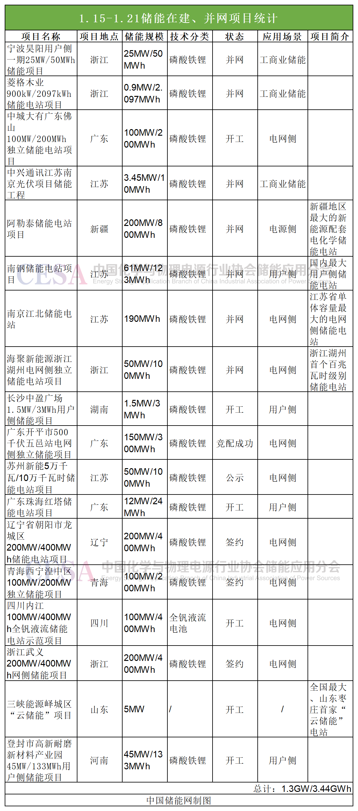 儲能項目方面,本周共有18個儲能項目簽約、開工或并網(wǎng),規(guī)模共計1.3GW/3.44GWh,其中包括多個首個、最大儲能項目。