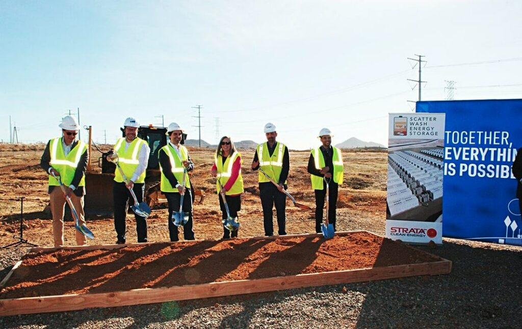 Strata Clean Energy公司總裁Josh Rogol(左三)與合作伙伴、當(dāng)?shù)卣鱿疭catter Wash電池儲(chǔ)能系統(tǒng)奠基儀式。