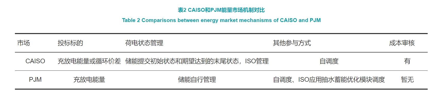 在FERC 841法案下,各ISO在選擇技術(shù)路線方面有一定的自主權(quán),本節(jié)以儲(chǔ)能規(guī)模最大的CAISO、PJM的市場(chǎng)機(jī)制為例進(jìn)行分析,見表2。