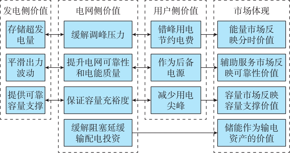 值得注意的是,儲(chǔ)能提供的同一項(xiàng)服務(wù),對(duì)于不同主體有不同的表現(xiàn)形式[20],如圖1所歸納。如削峰填谷,對(duì)電網(wǎng)而言表現(xiàn)為緩解調(diào)峰壓力[21],對(duì)新能源而言表現(xiàn)為存儲(chǔ)超發(fā)電量[22],對(duì)用戶而言表現(xiàn)為錯(cuò)峰用電[23]。由于本文的落腳點(diǎn)在于市場(chǎng)機(jī)制,從市場(chǎng)的角度來(lái)看,以上3個(gè)價(jià)值均可以通過(guò)能量市場(chǎng)分時(shí)的價(jià)格信號(hào)加以體現(xiàn),由市場(chǎng)采購(gòu)并統(tǒng)一提供。當(dāng)然,這些服務(wù)也可由發(fā)電側(cè)、用電側(cè)主體與儲(chǔ)能簽訂使用協(xié)議而自行購(gòu)買。具體選擇哪種模式,是儲(chǔ)能市場(chǎng)設(shè)計(jì)中待探討的問(wèn)題。