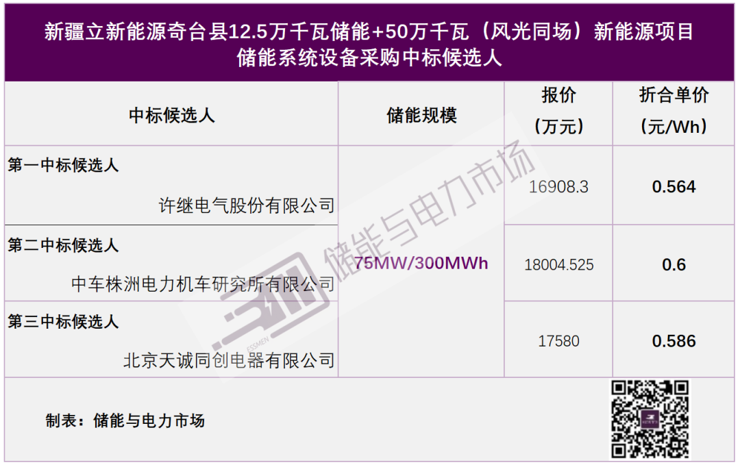 中國儲能網(wǎng)訊:2月8日,新疆立新能源奇臺縣12.5萬千瓦儲能+50萬千瓦(風(fēng)光同場)新能源項(xiàng)目儲能系統(tǒng)設(shè)備采購中標(biāo)候選人公示。涉及儲能規(guī)模75MW/300MWh,許繼電氣以單價0.564元/Wh,預(yù)中標(biāo)該項(xiàng)采購。