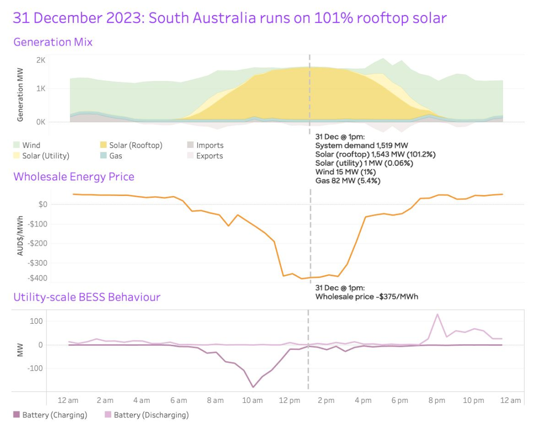 2023年12月31日下午,屋頂光伏發(fā)電可滿(mǎn)足南澳州101%的電力總需求。南澳州電網(wǎng)成為全球首個(gè)實(shí)現(xiàn)負(fù)運(yùn)營(yíng)需求(Operational Demand)的吉瓦規(guī)模電網(wǎng)。