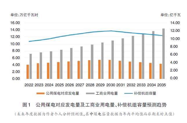 預(yù)計(jì)2024年煤電裝機(jī)約11.83億千瓦(年平均值),符合規(guī)定范圍的煤電容量約占煤電總?cè)萘康?5%,為10.05億千瓦,年利用小時(shí)數(shù)按4600小時(shí)計(jì)算,年發(fā)電量為4.62萬億千瓦時(shí)。按照到2030年碳達(dá)峰前煤電容量2%~5%的增長率增長、2030年后煤電容量和發(fā)電量負(fù)增長、年利用小時(shí)數(shù)由2024年的4600小時(shí)逐步降至2035年的4000小時(shí)測算,2024年到2035年歷年的補(bǔ)償容量及對(duì)應(yīng)的發(fā)電量預(yù)測情況見圖1。