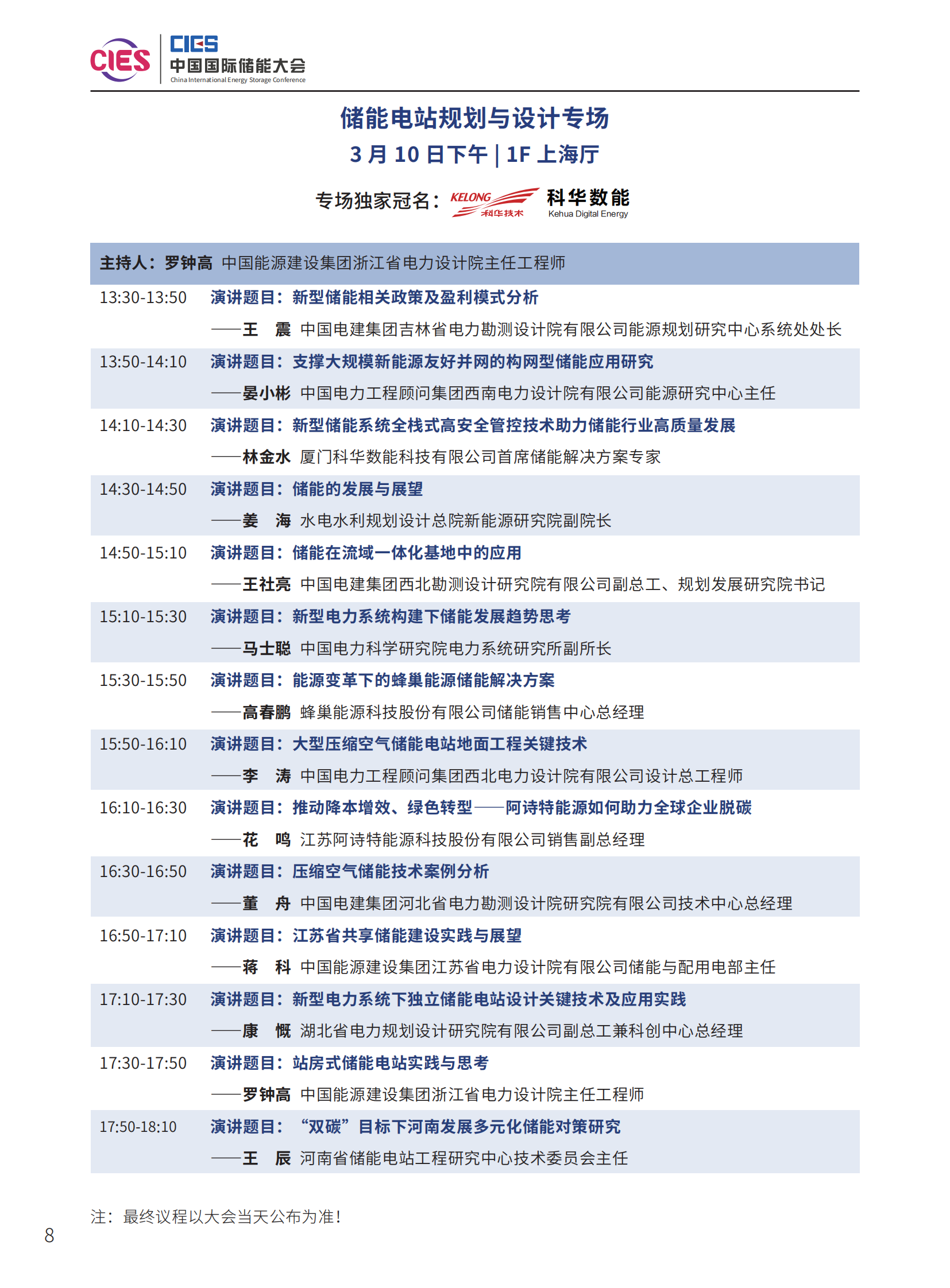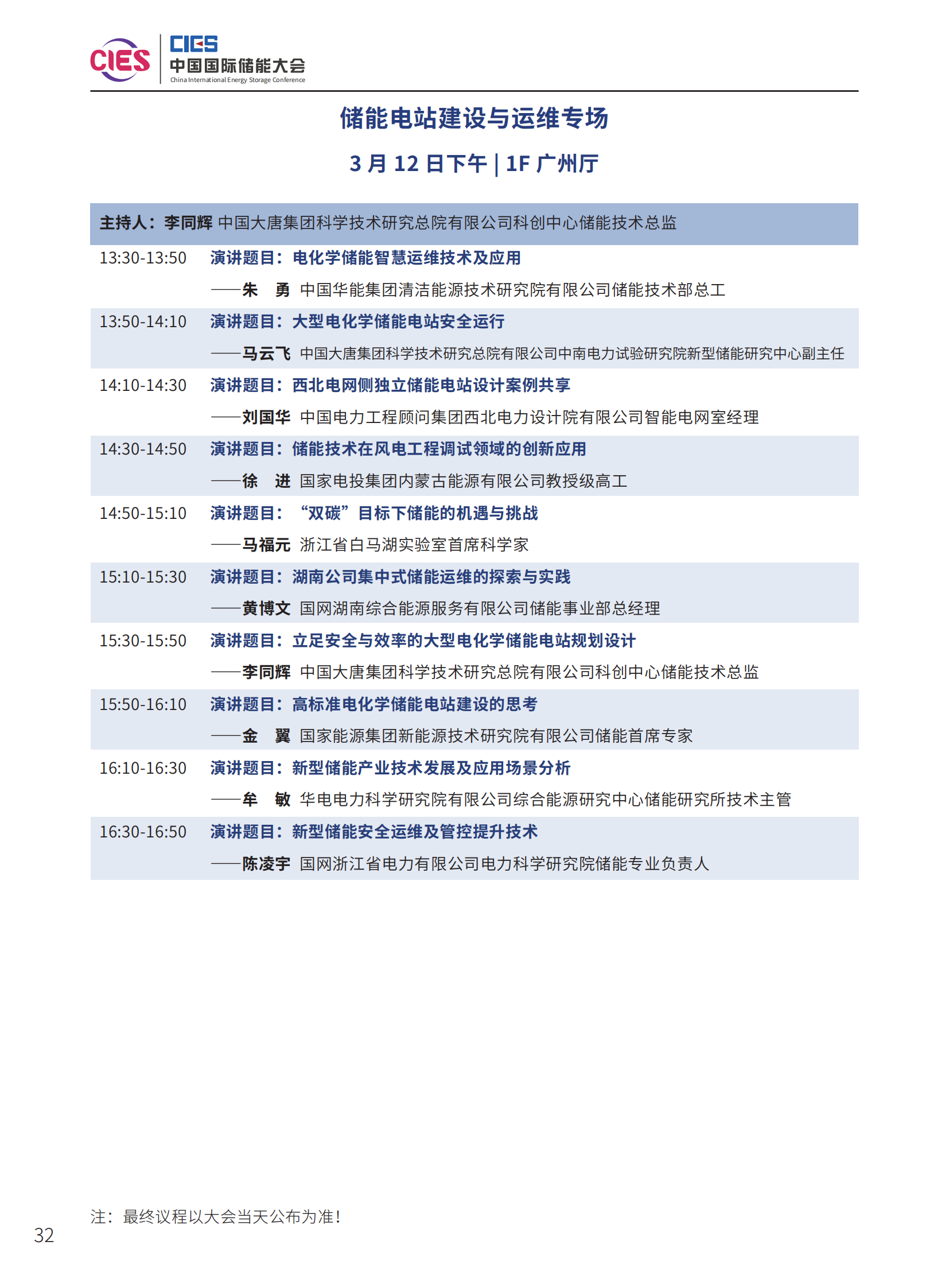 本次大會(huì)將安排大會(huì)開幕式暨院士/專家主題報(bào)告、工業(yè)綠色微電網(wǎng)專場、“雙碳”與新型電力系統(tǒng)、雙碳與新型電力系統(tǒng)暨南網(wǎng)儲(chǔ)能與可再生能源專場、新型儲(chǔ)能系統(tǒng)集成解決方案(上、中、下)、儲(chǔ)能電站規(guī)劃與設(shè)計(jì)、國際儲(chǔ)能、儲(chǔ)能檢測、認(rèn)證及標(biāo)準(zhǔn)、儲(chǔ)能溫控系統(tǒng)與安全、長時(shí)儲(chǔ)能、工商業(yè)儲(chǔ)能、新型儲(chǔ)能資本專場、儲(chǔ)能電站建設(shè)與運(yùn)維、多功能儲(chǔ)能(構(gòu)網(wǎng)型與混合)、新型電力系統(tǒng)與儲(chǔ)能電站建設(shè)、儲(chǔ)能新品發(fā)布等18個(gè)專場論壇。