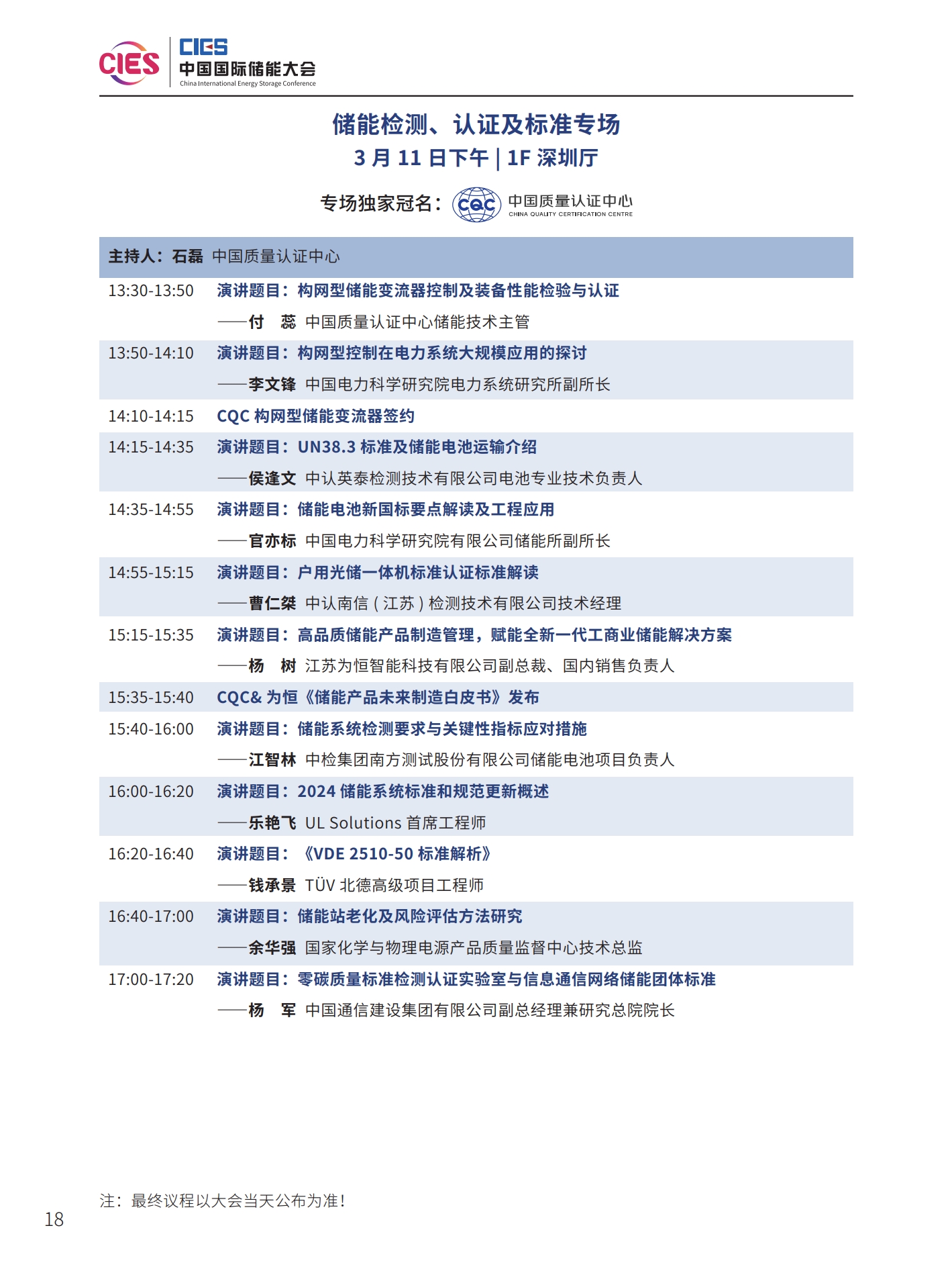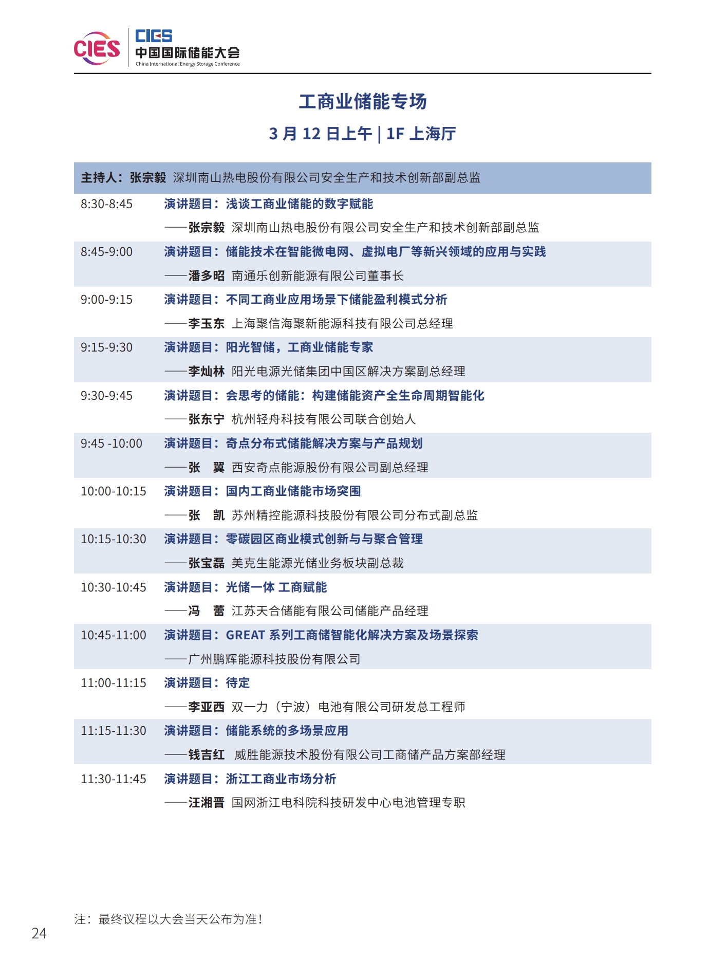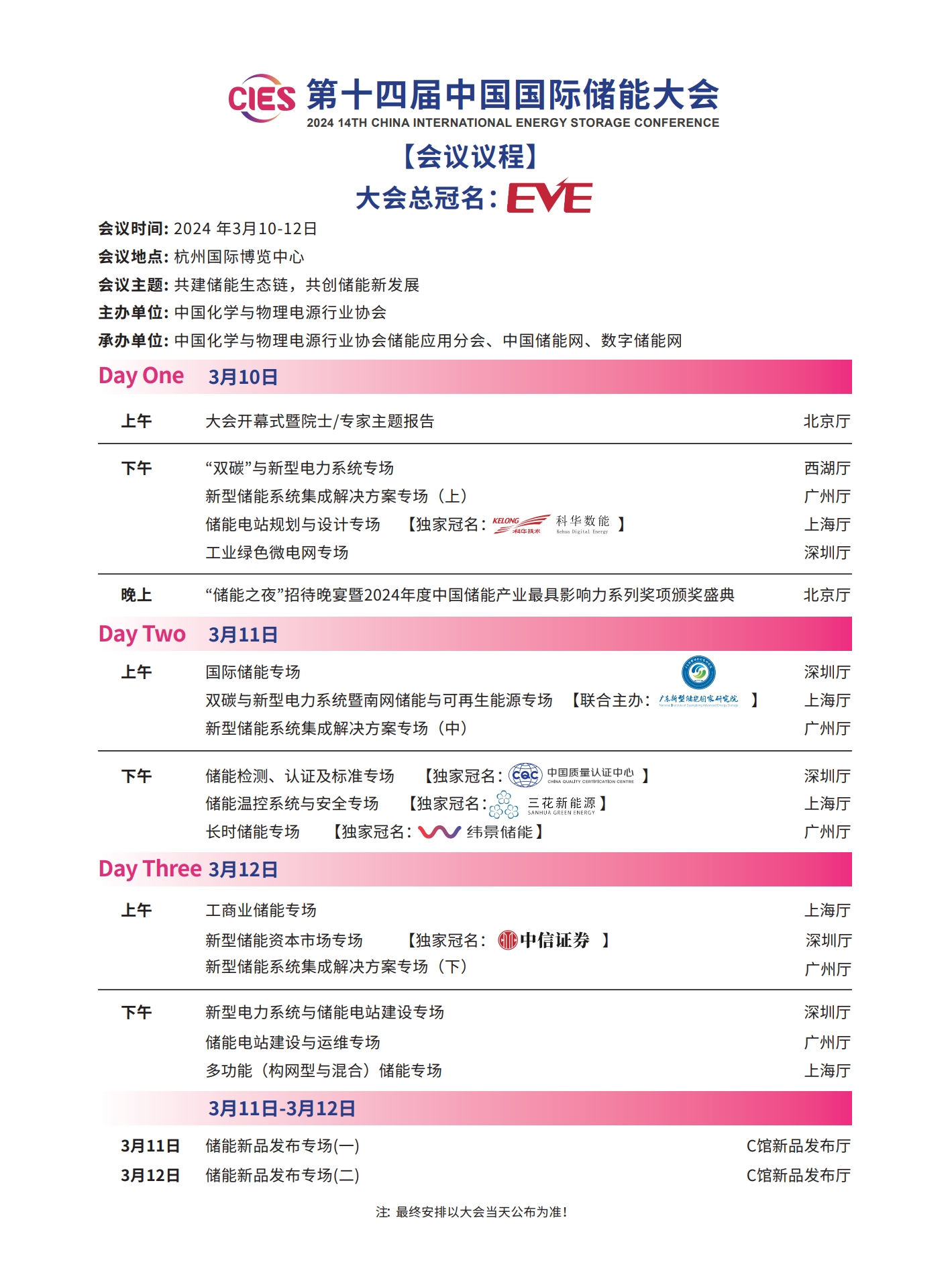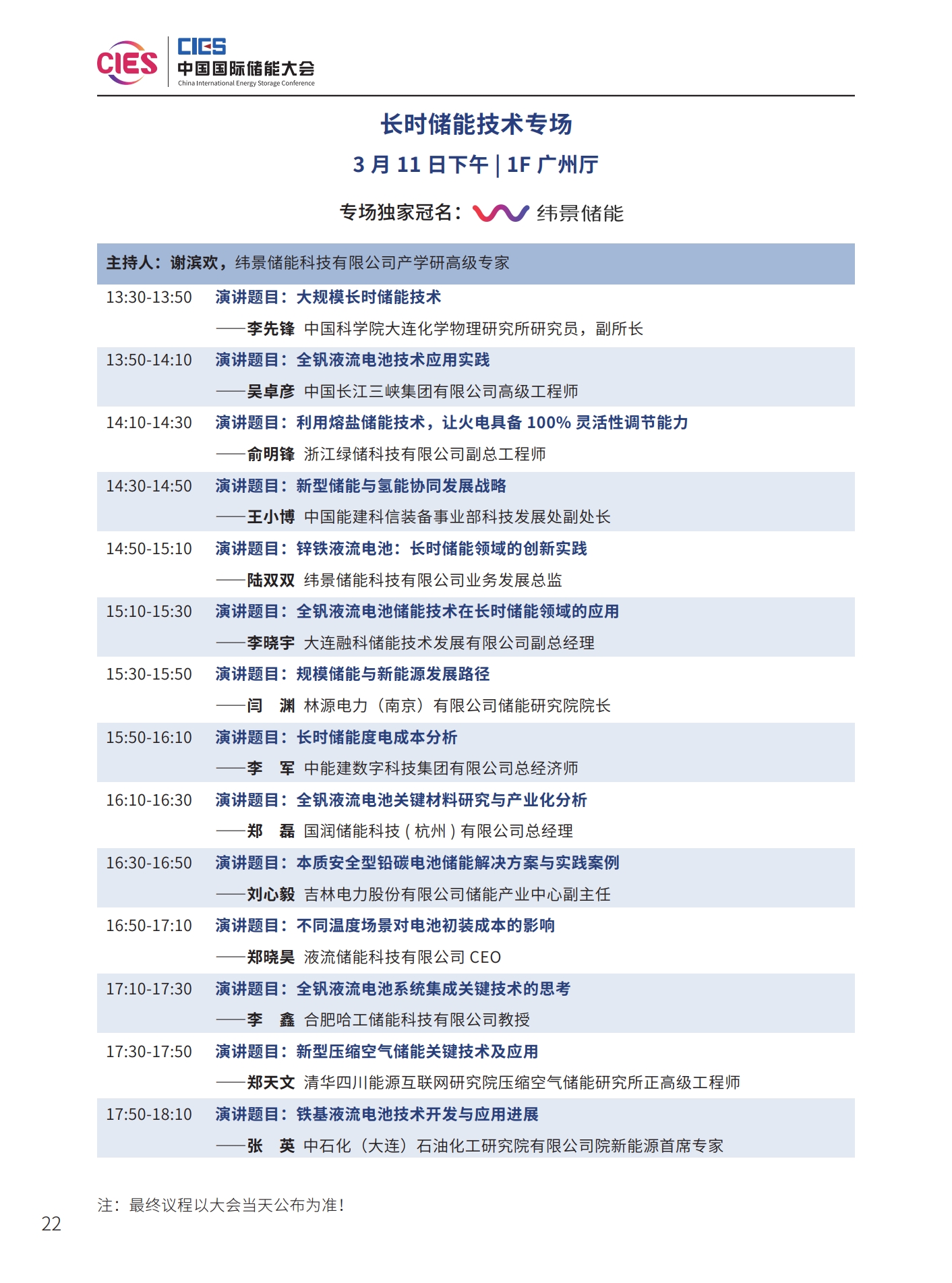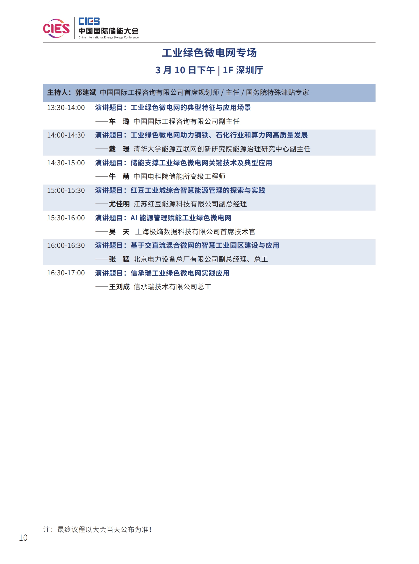 本次大會(huì)將安排有大會(huì)開(kāi)幕式暨院士/專家主題報(bào)告、工業(yè)綠色微電網(wǎng)、“雙碳”與新型電力系統(tǒng)(上、下)、新型儲(chǔ)能系統(tǒng)集成解決方案(上、中、下)、儲(chǔ)能電站規(guī)劃與設(shè)計(jì)、國(guó)際儲(chǔ)能、儲(chǔ)能檢測(cè)認(rèn)證及標(biāo)準(zhǔn)、儲(chǔ)能溫控系統(tǒng)與安全、長(zhǎng)時(shí)儲(chǔ)能技術(shù)、工商業(yè)儲(chǔ)能、新型儲(chǔ)能資本專場(chǎng)、儲(chǔ)能電站建設(shè)與運(yùn)維、多功能儲(chǔ)能(構(gòu)網(wǎng)型與混合)、新型電力系統(tǒng)與儲(chǔ)能電站建設(shè)、儲(chǔ)能新品發(fā)布(4場(chǎng))等22個(gè)專場(chǎng)論壇。