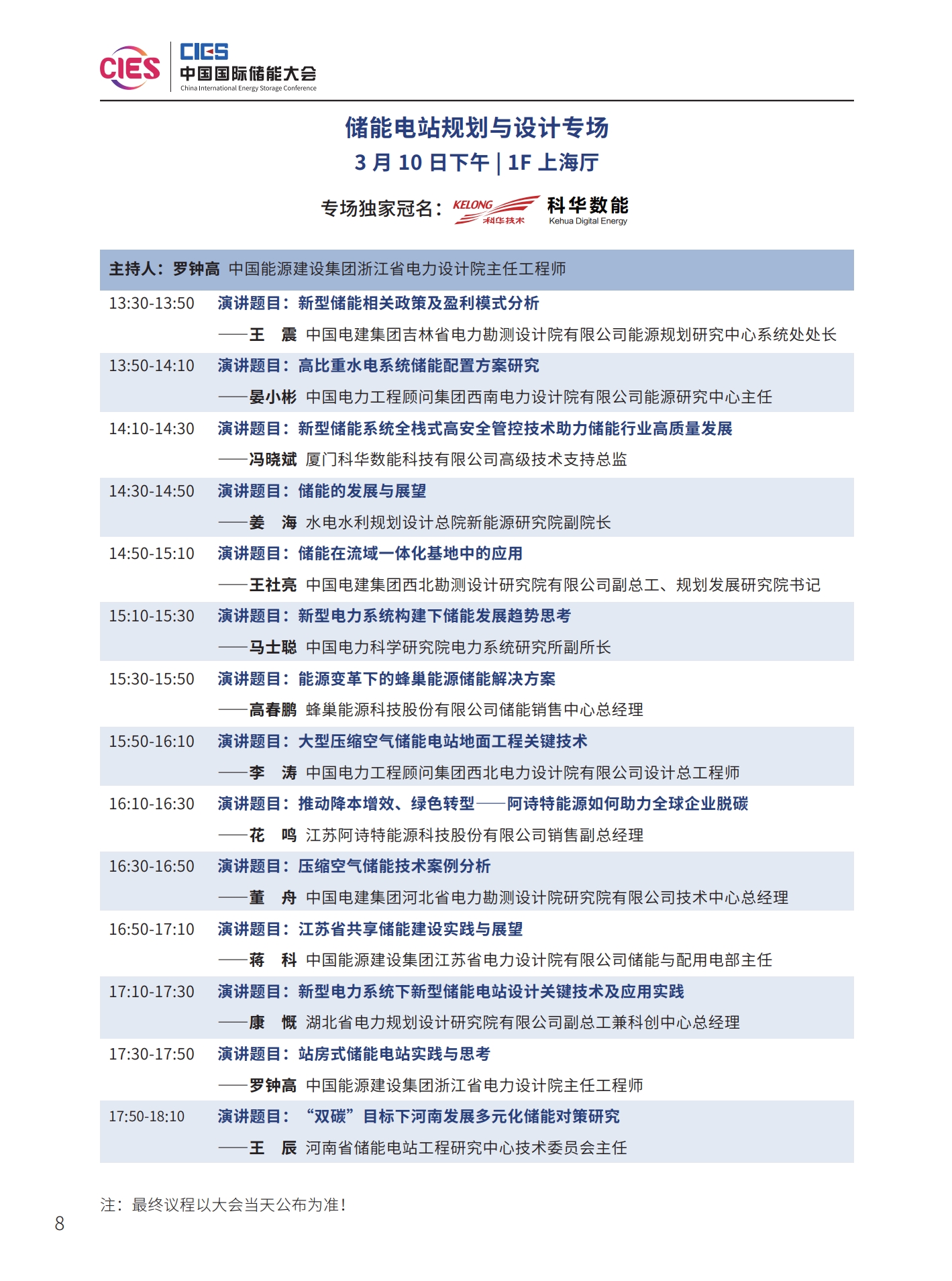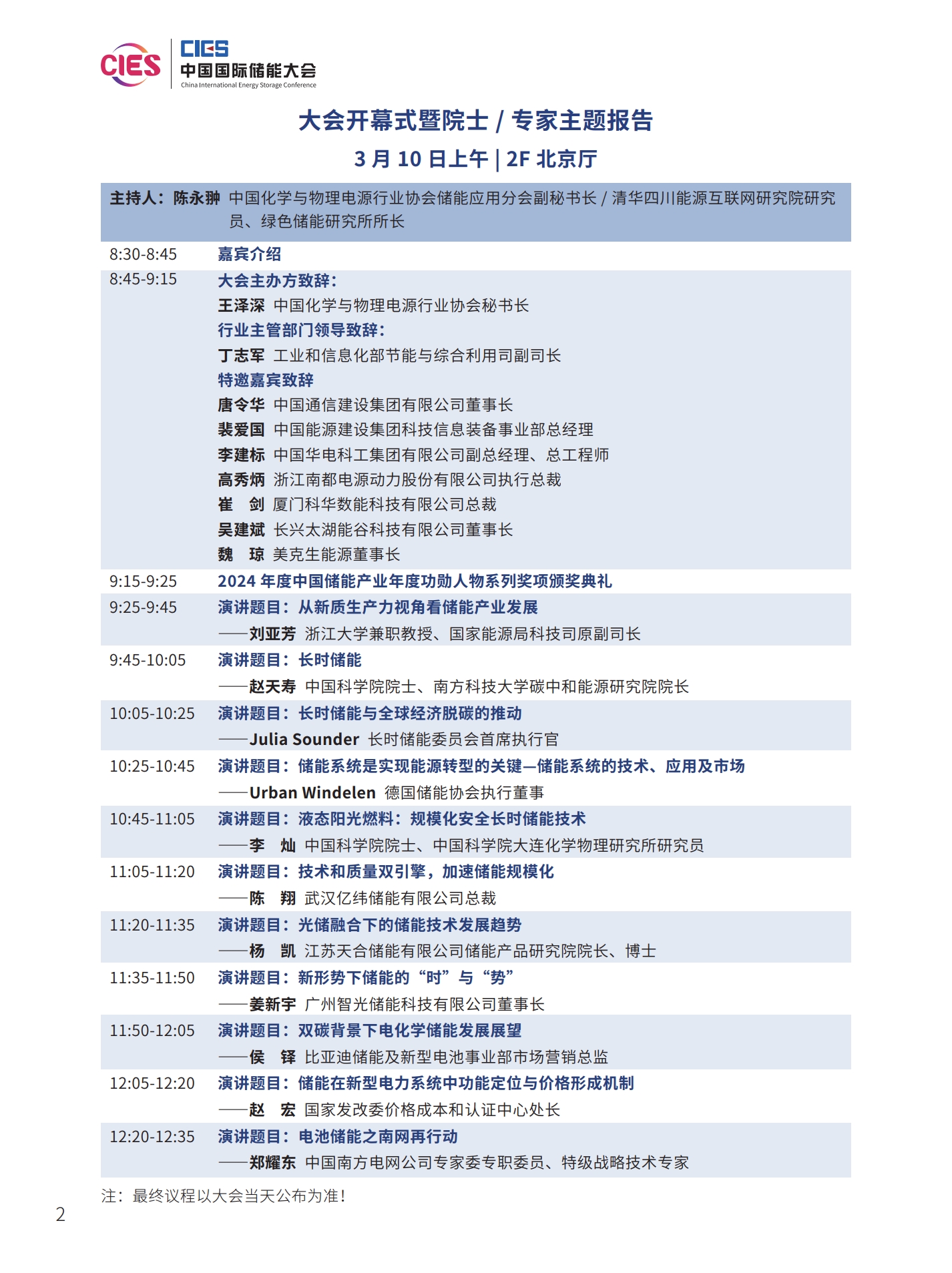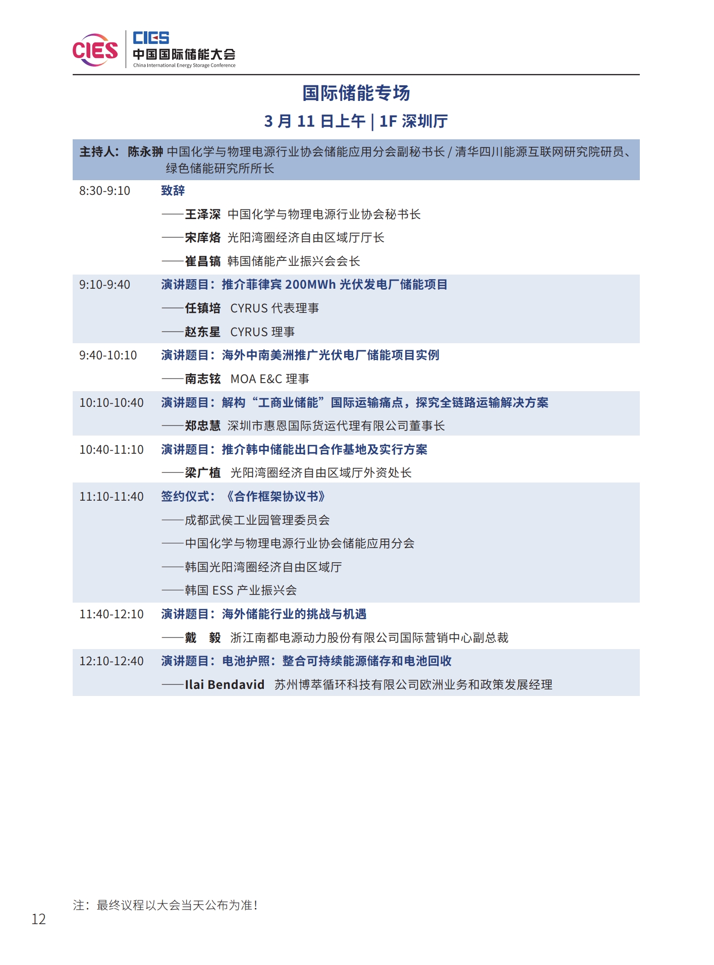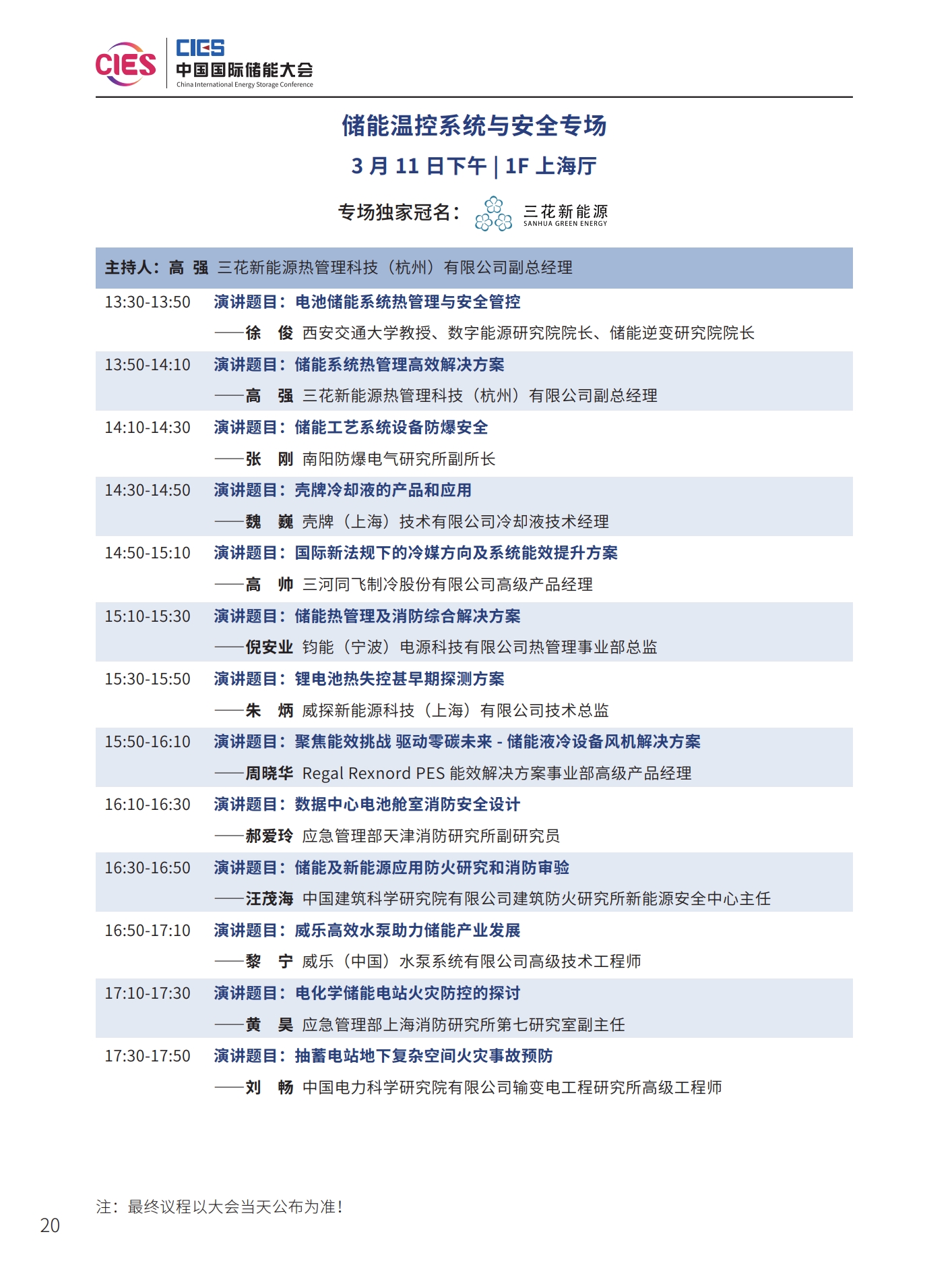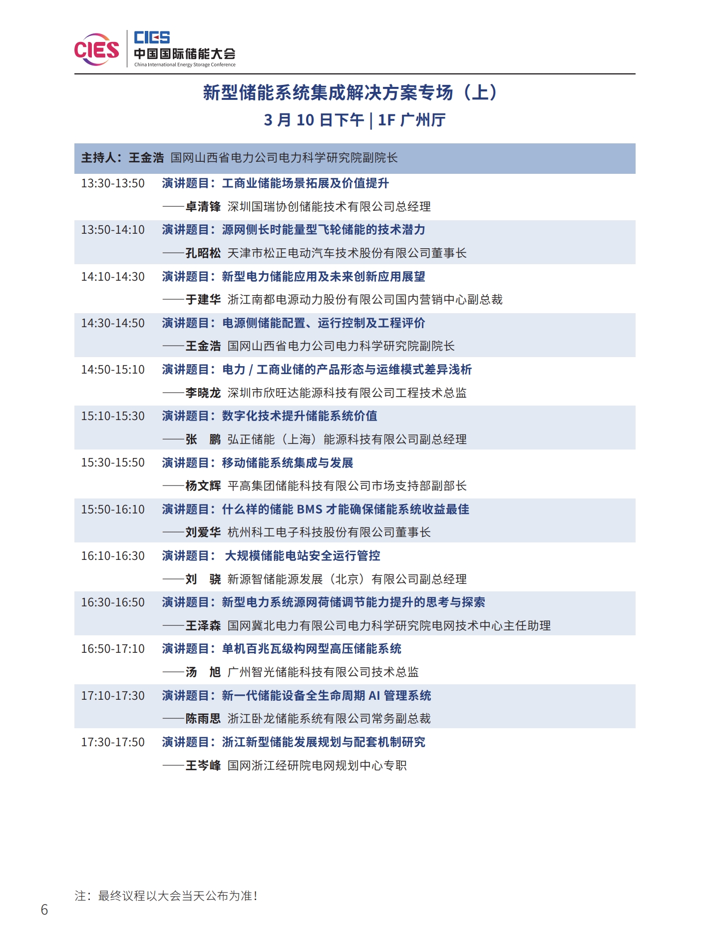 本次大會(huì)將安排有大會(huì)開(kāi)幕式暨院士/專家主題報(bào)告、工業(yè)綠色微電網(wǎng)、“雙碳”與新型電力系統(tǒng)(上、下)、新型儲(chǔ)能系統(tǒng)集成解決方案(上、中、下)、儲(chǔ)能電站規(guī)劃與設(shè)計(jì)、國(guó)際儲(chǔ)能、儲(chǔ)能檢測(cè)認(rèn)證及標(biāo)準(zhǔn)、儲(chǔ)能溫控系統(tǒng)與安全、長(zhǎng)時(shí)儲(chǔ)能技術(shù)、工商業(yè)儲(chǔ)能、新型儲(chǔ)能資本專場(chǎng)、儲(chǔ)能電站建設(shè)與運(yùn)維、多功能儲(chǔ)能(構(gòu)網(wǎng)型與混合)、新型電力系統(tǒng)與儲(chǔ)能電站建設(shè)、儲(chǔ)能新品發(fā)布(4場(chǎng))等22個(gè)專場(chǎng)論壇。