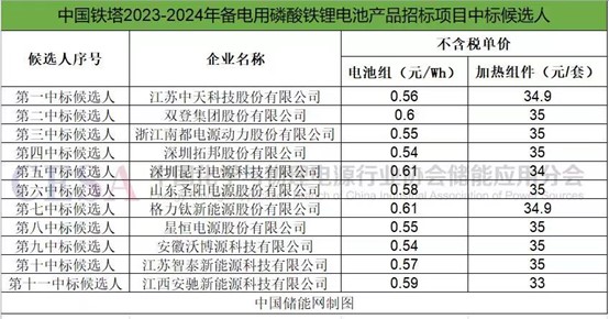 2023年12月28日,中國(guó)鐵塔2023-2024年備電用磷酸鐵鋰電池產(chǎn)品集中招標(biāo)項(xiàng)目公示中標(biāo)候選人。本項(xiàng)目共33名投標(biāo)人參與投標(biāo),最終,11家企業(yè)入圍中標(biāo)候選人。