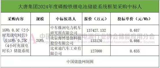 此前的一次大規(guī)模儲(chǔ)能系統(tǒng)集采進(jìn)展發(fā)生在2月18日,中國(guó)大唐集團(tuán)有限公司2024年度磷酸鐵鋰電池儲(chǔ)能系統(tǒng)框架采購(gòu)公示中標(biāo)結(jié)果,中車(chē)株洲所、海博思創(chuàng)、比亞迪三家企業(yè)中標(biāo),報(bào)價(jià)區(qū)間為0.635-0.687元/Wh。